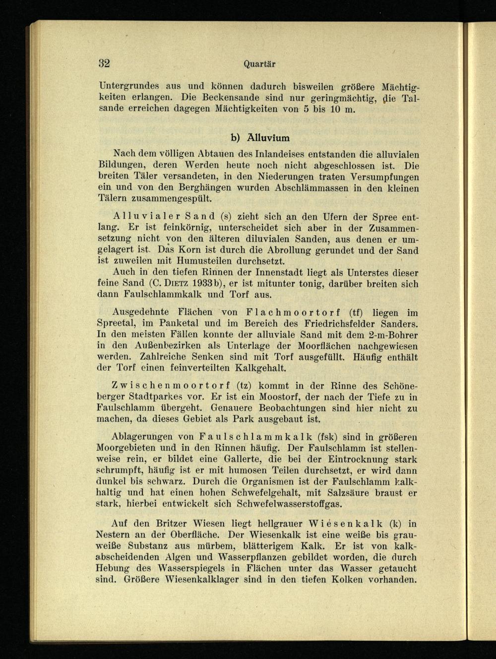 Alluvialer Sand(s) zieht sich an den Ufern der Spree entlang. Er ist feinkörnig, unterscheidet sich aber in der Zusammensetzung nicht von den älteren diluvialen Sanden, aus denen er umgelagert ist. Das Korn ist durch die Abrollung gerundet und der Sand ist zuweilen mit Humusteilen durchsetzt.