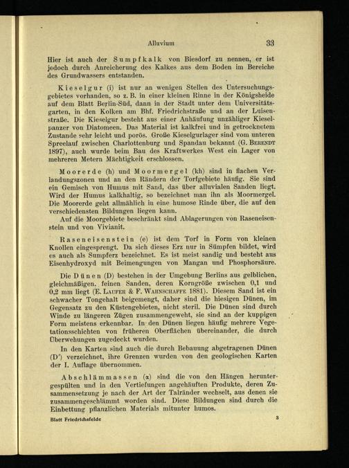 Kieselgur(i) ist nur an wenigen Stellen des Untersuchungsgebietes vorhanden, so z. B. in einer kleinen Rinne in der Königsheide auf dem Blatt Berlin-Süd, dann in der Stadt unter dem Universitätsgarten, in den Kolken am Bhf. Friedrichstraße und an der Lmisenstraße. Die Kieselgur besteht aus einer Anhäufung unzähliger Kieselpanzer von Diatomeen. Das Material ist kalkfrei und in getrocknetem Zustande sehr leicht und porös. Große Kieselgurlager sind vom unteren Spreelauf zwischen Charlottenburg und Spandau bekannt(G. BERENDT 1897), auch wurde beim Bau des Kraftwerkes West ein Lager von mehreren Metern Mächtigkeit erschlossen.