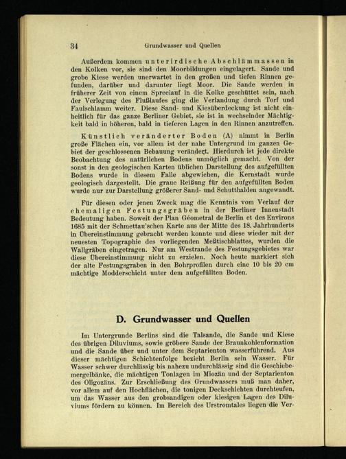 Künstlich veränderter Boden(A) nimmt in Berlin große Flächen ein, vor allem ist der nahe Untergrund im ganzen Gebiet der geschlossenen Bebauung verändert. Hierdurch ist jede direkte Beobachtung des natürlichen Bodens unmöglich gemacht. Von der sonst in den geologischen Karten üblichen Darstellung des aufgefüllten Bodens wurde in diesem Falle abgewichen, die Kernstadt wurde geologisch dargestellt. Die graue Reißung für den aufgefüllten Boden wurde nur zur Darstellung größerer Sand- und Schutthalden angewandt.