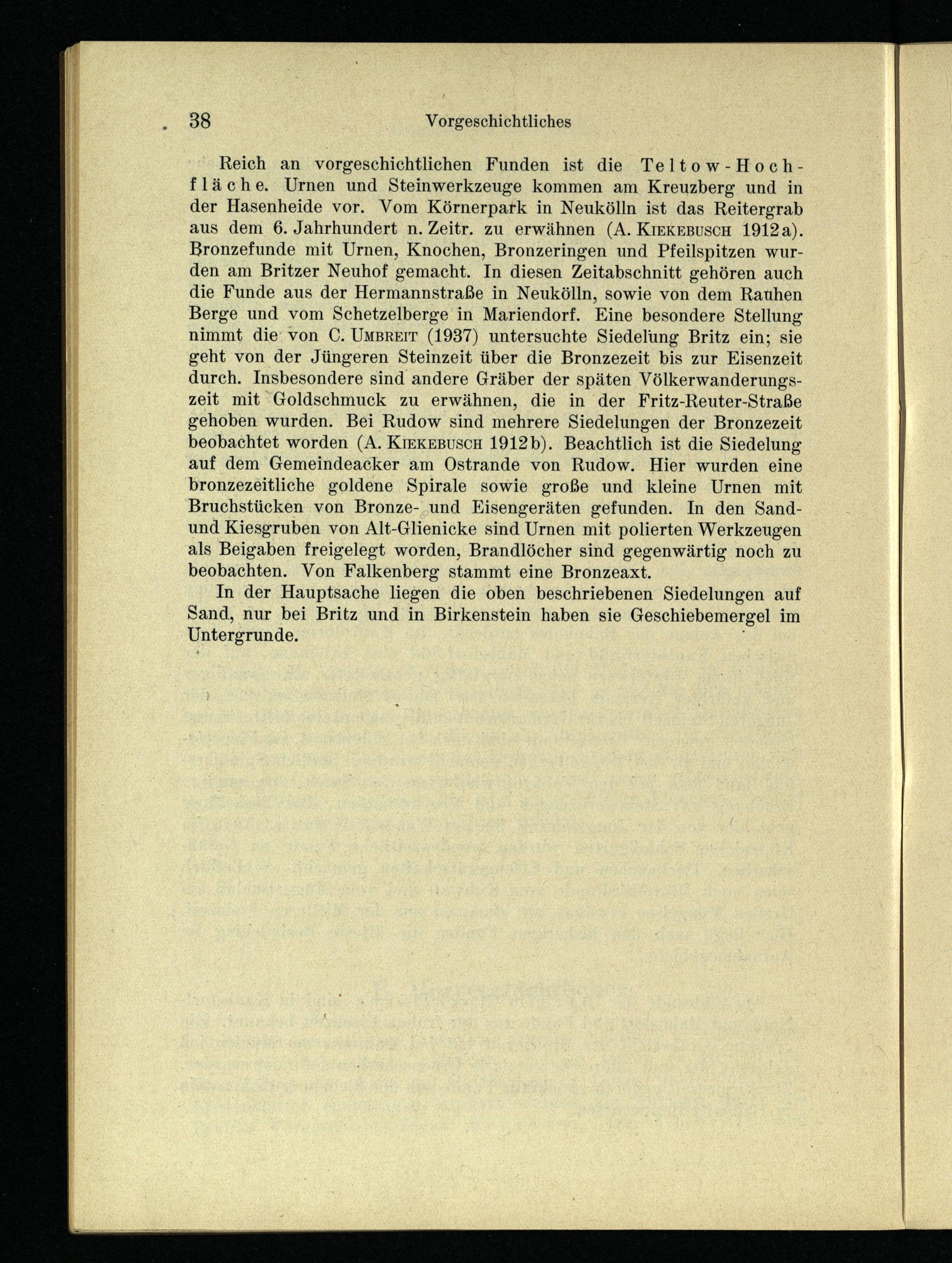 Reich an vorgeschichtlichen Funden ist die Teltow-Hochfläche. Urnen und Steinwerkzeuge kommen am Kreuzberg und in der Hasenheide vor. Vom Körnerpark in Neukölln ist das Reitergrab aus dem 6. Jahrhundert n. Zeitr. zu erwähnen(A. KIıeKEBUSsCH 1912a). Bronzefunde mit Urnen, Knochen, Bronzeringen und Pfeilspitzen wurden am Britzer Neuhof gemacht. In diesen Zeitabschnitt gehören auch die Funde aus der Hermannstraße in Neukölln, sowie von dem Rauhen Berge und vom Schetzelberge in Mariendorf. Eine besondere Stellung nimmt die‘ von C. UMBrEIT(1937) untersuchte Siedelung Britz ein; sie geht von der Jüngeren Steinzeit über die Bronzezeit bis zur Eisenzeit durch. Insbesondere sind andere Gräber der späten Völkerwanderungszeit mit Goldschmuck zu erwähnen, die in der Fritz-Reuter-Straße gehoben wurden. Bei Rudow sind mehrere Siedelungen der Bronzezeit beobachtet worden(A. KIEKEBUSCH 1912b). Beachtlich ist die Siedelung auf dem Gemeindeacker am Ostrande von Rudow. Hier wurden eine bronzezeitliche goldene Spirale sowie große und kleine Urnen mit Bruchstücken von Bronze- und Eisengeräten gefunden. In den Sandund Kiesgruben von Alt-Glienicke sind Urnen mit polierten Werkzeugen als Beigaben freigelegt worden, Brandlöcher sind gegenwärtig noch zu beobachten. Von Falkenberg stammt eine Bronzeaxt.