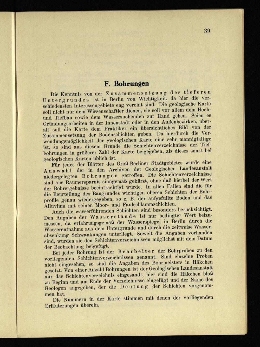Für jedes der Blätter des Groß-Berliner Stadtgebietes wurde eine Auswahl der in den Archiven der Geologischen Landesanstalt niedergelegten Bohrungen getroffen. Die Schichtenverzeichnisse sind aus Raumersparnis sinngemäß gekürzt, ohne daß hierbei der Wert der Bohrergebnisse beeinträchtigt wurde. In allen Fällen sind die für die Beurteilung des Baugrundes wichtigen oberen Schichten der Bohrprofile genau wiedergegeben, SO zZ. B. der aufgefüllte Boden und das Alluvium mit seinen Moor- und Faulschlammschichten.