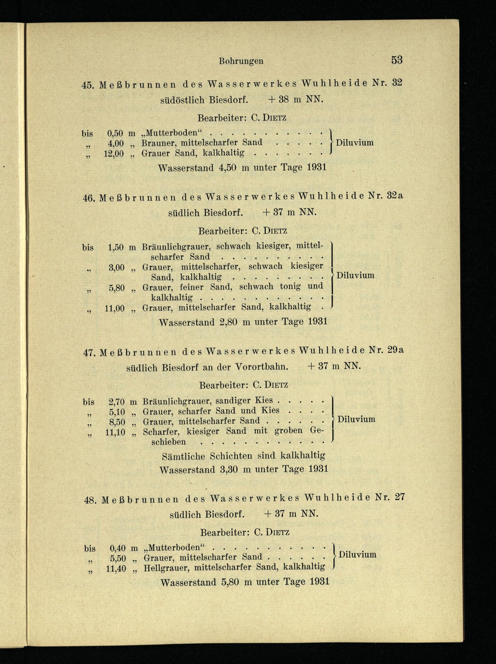 Sämtliche Schichten sind kalkhaltig Wasserstand 3,30 m unter Tage 1931