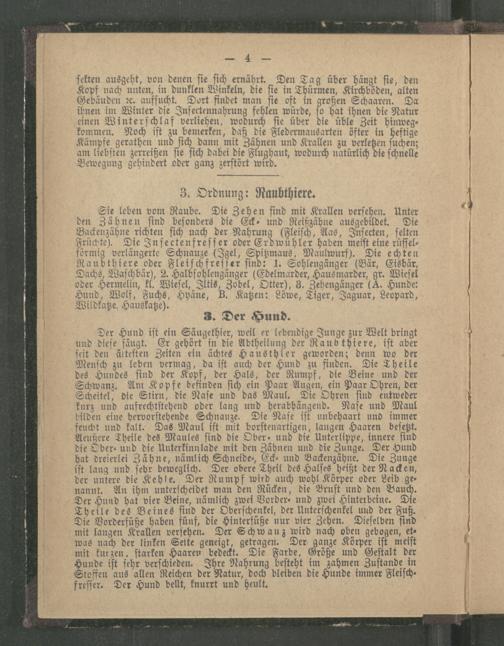 Sie leben vom Raube. Die Zehen ſind mit Krallen verſehen. Unter den Zähnen find beſonders die Eck- und Reißzähne ausgebildet. Die Backenzähne richten ſich nach der Nahrung(Fleiſch, Aas, Inſecten, ſelten Früchte). Die Inſectenfreſſer oder Erdwühler haben meiſt eine rüſſelförmig verlängerte Schnauze(Igel, Spitzmaus, Maulwurf). Die echten Raubthiere oder Fleiſchfreſſer find: 1. Sohlengänger(Bär, Eisbär, Dachs, Waſchbär), 2. Halbſohlengänger(Edelmarder, Hausmarder, gr. Wieſel oder Hermelin, kl. Wieſel, Iltis, Zobel, Otter), 8. Zehengänger(A. Hunde: Hund, Wolf, Fuchs, Hyäne, B. Katzen: Löwe, Tiger, Jaguar, Leopard,