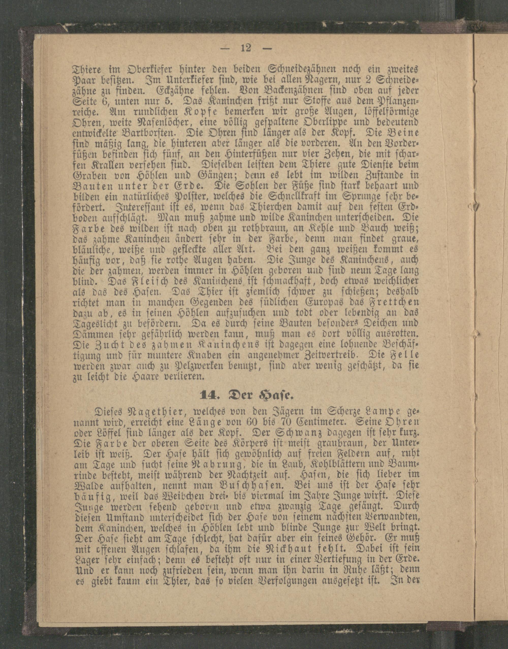 Dieſes Nagethier, welches von den Jägern im Scherze Lampe ges nannt wird, erreicht eine Länge von 60 bis 70 Centimeter. Seine Ohren oder Löffel ſind länger als der Kopf. Der Schwanz dagegen iſt ſehr kurz. Die Farbe der oberen Seite des Körpers iſt meiſt graubraun, der Untere leib iſt weiß. Der Haſe hält ſich gewöhnlich auf freien Feldern auf, ruht am Tage und ſucht feine Nahrung, die in Laub, Kohlblättern und Baumrinde beſteht, meiſt während der ö auf. Haſen, die ſich lieber im Walde aufhalten, nennt man Buſchhaſen. Bei uns iſt der Haſe ſehr häu fig, weil das Weibchen drei⸗ bis viermal im Jahre Junge wirft. Dieſe Junge werden ſehend geboren und etwa zwanzig Tage, geſäugt. Durch dieſen Umſtand unterſcheidet ſich der Haſe von feinem nächſten Verwandten, dem Kaninchen, welches in Höhlen lebt und blinde Junge zur Welt bringt. Der Haſe ſieht am Tage ſchlecht, hat dafür aber ein feines Gehör. Er muß mit offenen Äugen ſchlafen, da ihm die Nickhaut fehlt. Dabei iſt fein Lager ſehr einfach; denn es beſteht oft nur in einer Vertiefung in der Erde. Und er kann noch zufrieden ſein, wenn man ihn darin in Ruhe läßt; denn es giebt kaum ein Thier, das ſo vielen Verfolgungen ausgeſetzt iſt. In der