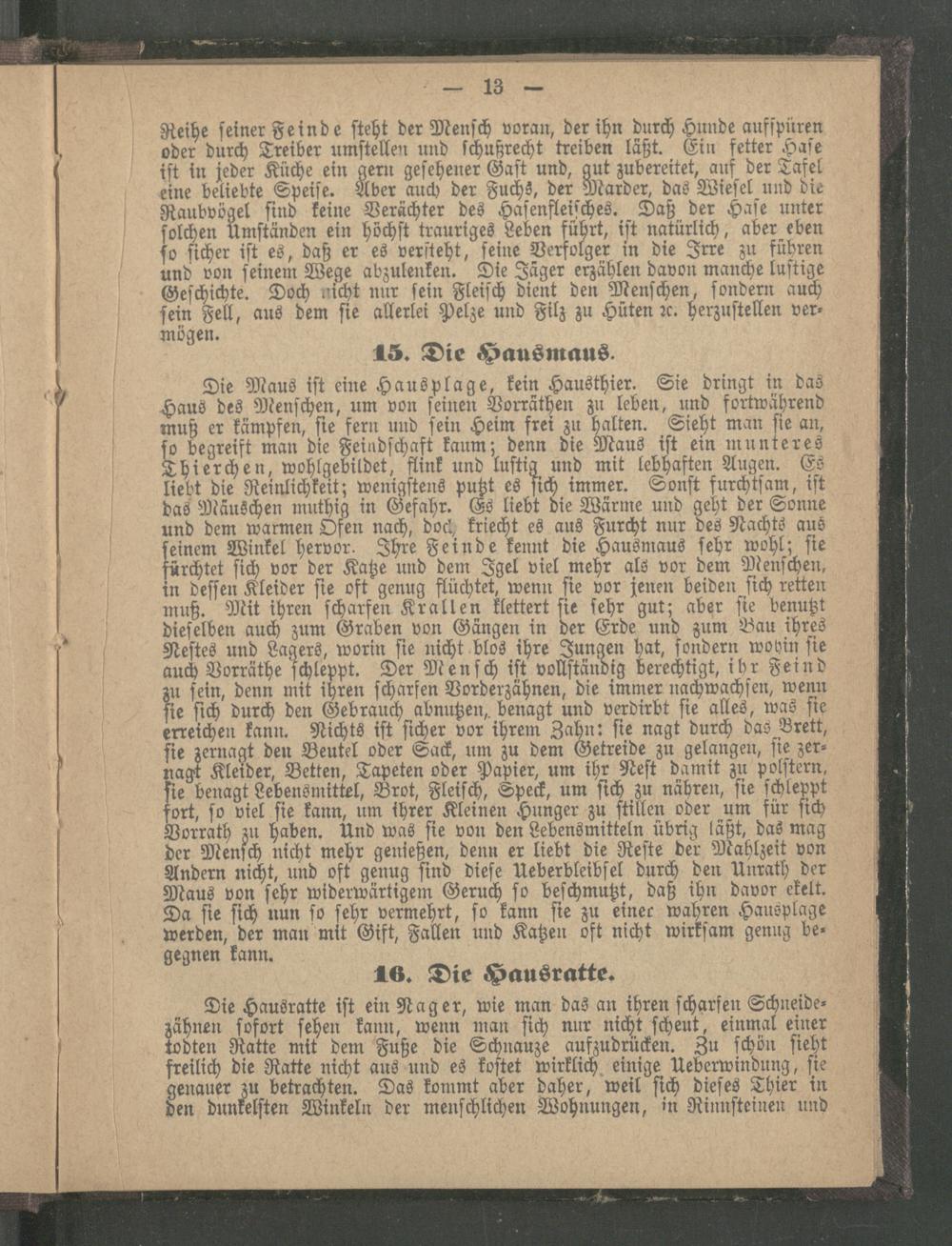 „Die hausratte iſt ein Nag er, wie man das an ihren ſcharfen Schneidezähnen ſofort ſehen kann, wenn man ſich nur nicht ſcheut, einmal einer todten Ratte mit dem Fuße die Schnauze aufzudrücken. Zu ſchön ſieht freilich die Ratte nicht aus und es koſtet wirklich einige Ueberwindung, fie genauer zu betrachten. Das kommt aber daher, weil ſich dieſes Thier in den dunkelſten Winkeln der menſchlichen Wohnungen, in Rinnſteinen und