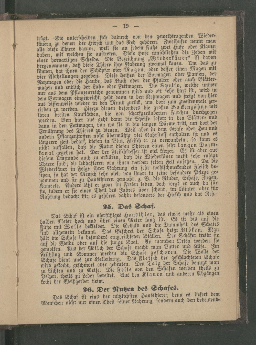 Das Schaf iſt ein vierfüßiges Hausthier, das etwas mehr als einen halben Meter hoch und über einen Meter lang iſt. Es iſt bis auf die Füße mit Wolle bekleidet. Die Geduld und die Dummheit des Schafes ſind allgemein bekannt. Das Geſchrei der Schafe heißt Blöken. Man hält die Schafe in beſonders eingerichteten Ställen. Der Schäfer treibt ſie auf die Weide oder auf die junge Saat. An manchen Orten werden ſie emolken. Aus der Milch der Gh fe macht man Butter und Käſe. Im ir en und Sommer werden die Schafe geſchoren— Die Wolle der Schafe dient uns zur Bekleidung. Das Fleifch der geſchlachteten Schafe wird gekocht, geſchmort oder gebraten. Den Talg der Schafe benutzt man zu Lichten und zu Seife. Die Felle von den Schafen werden theils zu chen, theils zu Leder bereitet. Aus den Klauen und anderen Abgängen ocht der Weißgerber Leim.