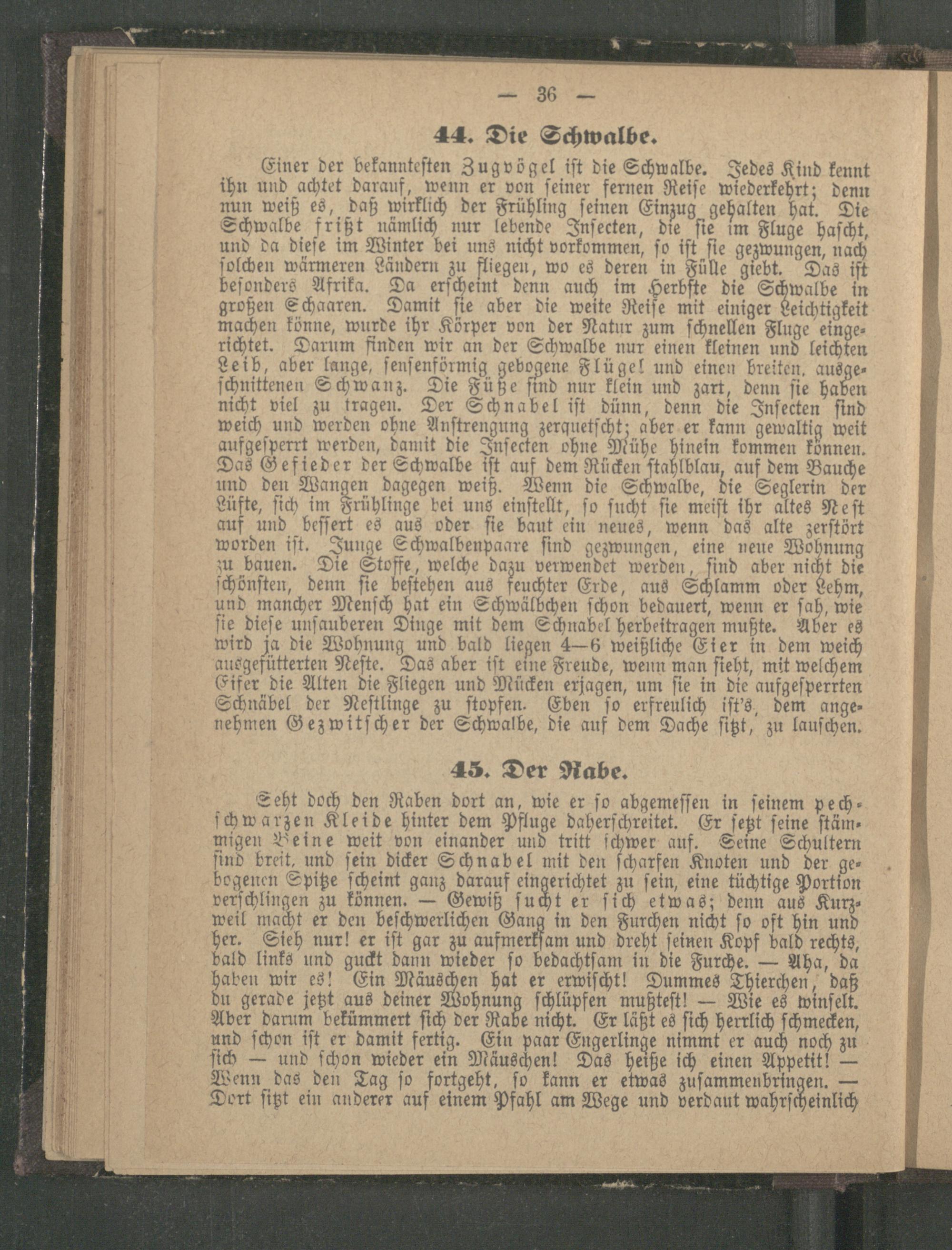 Einer der bekannteſten Zug vögel iſt die Schwalbe. Jedes Kind kennt ihn und achtet darauf, wenn er von ſeiner fernen Reiſe wiederkehrt; denn nun weiß es, daß wirklich der Frühling ſeinen Einzug gehalten hat. Die Schwalbe frißt nämlich nur lebende Inſecten, die ſie im Fluge haſcht, und da dieſe im Winter bei uns nicht vorkommen, ſo iſt ſie gezwungen, nach ſolchen wärmeren Ländern zu fliegen, wo es deren in Fülle giebt. Das ißt beſonders Afrika. Da erſcheint denn auch im Herbſte die Schwalbe in großen Schaaren. Damit ſie aber die weite Reiſe mit einiger Leichtigkeit machen könne, wurde ihr Körper von der Natur zum ſchnellen Fluge eingerichtet. Darum finden wir an der Schwalbe nur einen kleinen und leichten Leib, aber lange, ſenſenförmig gebogene Flügel und einen breiten. ausge ſchnittenen Schwanz. Die Füße ſind nur klein und zart, denn ſie haben nicht viel zu tragen. Der Schnabel iſt dünn, denn die Inſecten find weich und werden ohne Anſtrengung zerquetſcht; aber er kann gewaltig weit aufgeſperrt werden, damit die Inſecten ohne Mühe hinein kommen können. Das Gefieder der Schwalbe iſt auf dem Rücken ſtahlblau, auf dem Bauche und den Wangen dagegen weiß. Wenn die Schwalbe, die Seglerin der Lüfte, ſich im Frühlinge bei ung einſtellt, ſo fucht ſie meiſt ihr altes Neſt auf und beſſert es aus oder ſie baut ein neues, wenn das alte zerſtört worden iſt. Junge Schwalbenpaare find gezwungen, eine neue Wohnung zu bauen. Die Stoffe, welche dazu verwendet werden find aber nicht die ſchönſten, denn ſie beſtehen aus feuchter Erde, aus Schlamm oder Lehm, und mancher Menſch hat ein Schwälbchen ſchon bedauert, wenn er ſah, wie ſie dieſe unſauberen Dinge mit dem Schnabel herbeitragen mußte. Aber es wird ja die Wohnung und bald liegen 4—6 weißliche Eier in dem weich ausgefütterten Neſte. Das aber iſt eine Freude, wenn man ſieht, mit welchem Eifer die Alten die Fliegen und Mücken erjagen, um ſie in die aufgeſperrten Schnäbel der Neſtlinge zu ſtopfen. Eben fo erfreulich iſt's, dem ange» nehmen Gezwitſcher der Schwalbe, die auf dem Dache ſitzt, zu lauſchen.