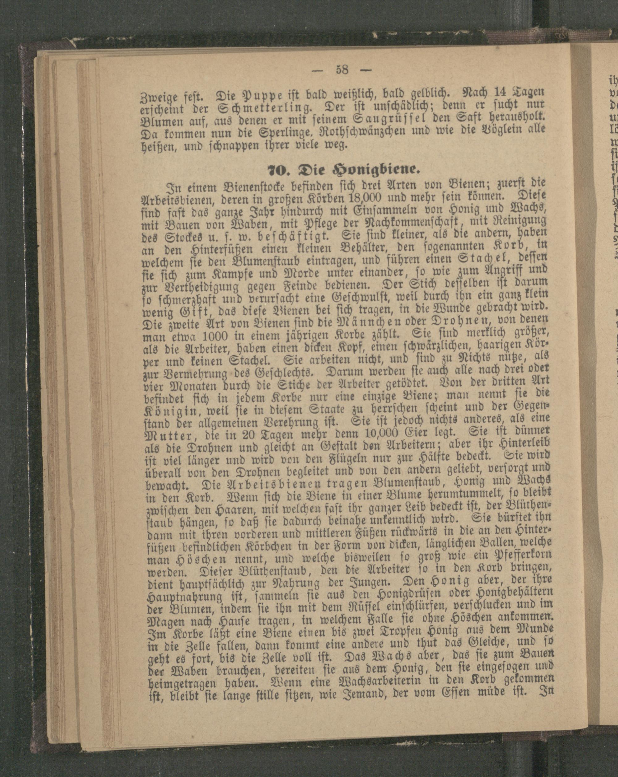 In einem Bienenſtocke befinden ſich drei Arten von Bienen; zuerſt die Arbeitsbienen, deren in großen Körben 18000 und mehr fein können. Dieſe find faſt das ganze Jahr hindurch mit Einſammeln von Honig und Wachs, mit Bauen von Waben, mit Pflege der Nachkommenſchaft, mit Reinigung des Stockes u. ſ. w. beſchäftfigt. Sie find kleiner, als die andern, haben an den Hinterfüßen einen kleinen Behälter, den ſogenannten Korb, in welchem fie den Blumenſtaub eintragen, und führen einen Stach el, deſſen ſie ſich zum Kampfe und Morde unter einander, ſo wie zum Angriff und zur Vertheidigung gegen Feinde bedienen. Der Stich deſſelben iſt darum fo ſchmerzhaft und verurſacht eine Geſchwulſt, weil durch ihn ein ganz klein wenig Gift, das dieſe Bienen bei ſich tragen, in die Wunde gebracht wird. Die zweite Art von Bienen find die Männchen oder Drohnen, von denen man etwa 1060 in einem jährigen Korbe zählt. Sie find merklich größer, als die Arbeiter, haben einen dicken Kopf, einen ſchwärzlichen, haarigen Körper und keinen Stachel. Sie arbeiten nicht, und ſind zu Nichts nütze, als zur Vermehrung des Geſchlechts. Darum werden fie auch alle nach drei oder dier Monaten durch die Stiche der Arbeiter getödtet. Von der dritten Art befindet ſich in jedem Korbe nur eine einzige Biene; man nennt ſie die Königin, weil ſie in dieſem Stagte zu herrſchen ſcheint und der Segen»