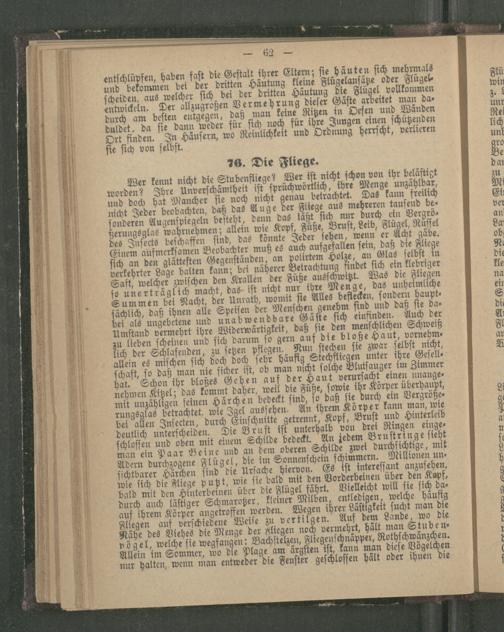 entſchlüpfen, haben faſt die Geſtalt ihrer Eltern; fie häuten ſich mehrmals und bekommen bei der dritten Häutung kleine Flügelanſätze oder Flügelſcheiden, aus welcher ſich bei der dritten Häutung die Flügel vollkommen entwickeln. Der allzugroßen Vermehrung dieſer Gäſte arbeitet man Das durch am beſten entgegen, daß man keine Ritzen in Defen und Wänden duldet, da ſie dann weder für ſich noch für ihre Jungen einen ſchützenden Ort finden. In Häuſern, wo Reinlichkeit und Ordnung herrſcht, verlieren ſte ſich von ſelbſt. 76. Die Fliege.