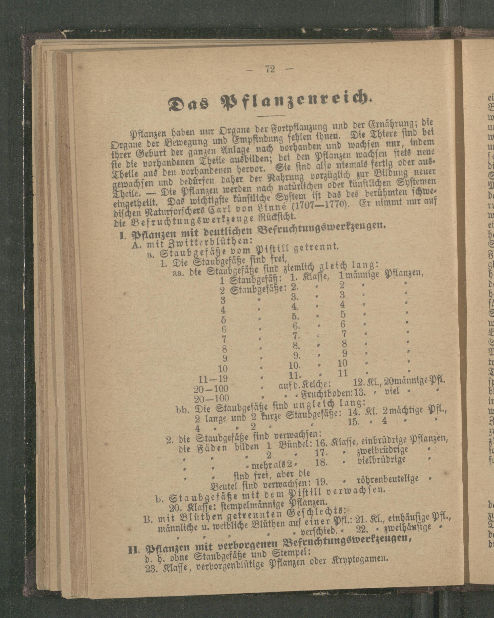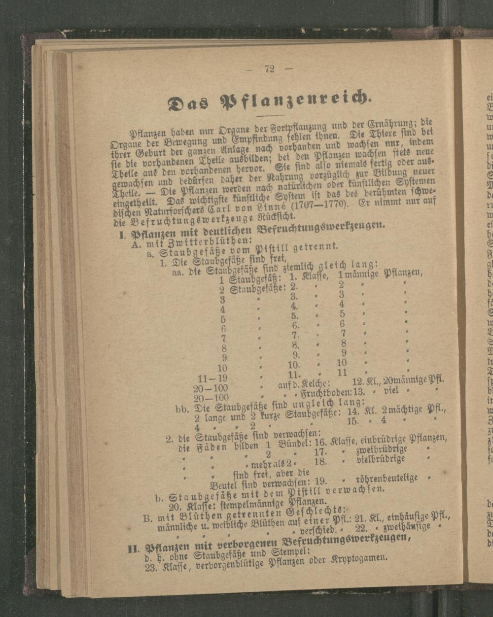 Pflanzen haben nur Organe der Fortpflanzung und der Ernährung; bie Organe der Bewegung und Empfindung fehlen thnen. Die Thtere sind bet threr Geburt der ganzen Anlage nach vorhanden und wachsen nur, indem fie die vorhandenen Theile ausbilden; bet den Pflanzen wachsen stets neue Theile aus den vorhandenen hervor. Sie find also niemals fertig oder ausgewachsen und bedürfen daher der Nahrung vorzüglich zur Bildung neuer Thetle. Die Pflanzen werden nach natürlichen oder künstlichen Systemen eingetheilt. Das wichtigste fünftliche System ist das des berühmten schwe dischen Naturforschers Carl von einné( 1707-1770). Er nimmt nur auf die Befruchtungswerkzeuge Rücksicht.