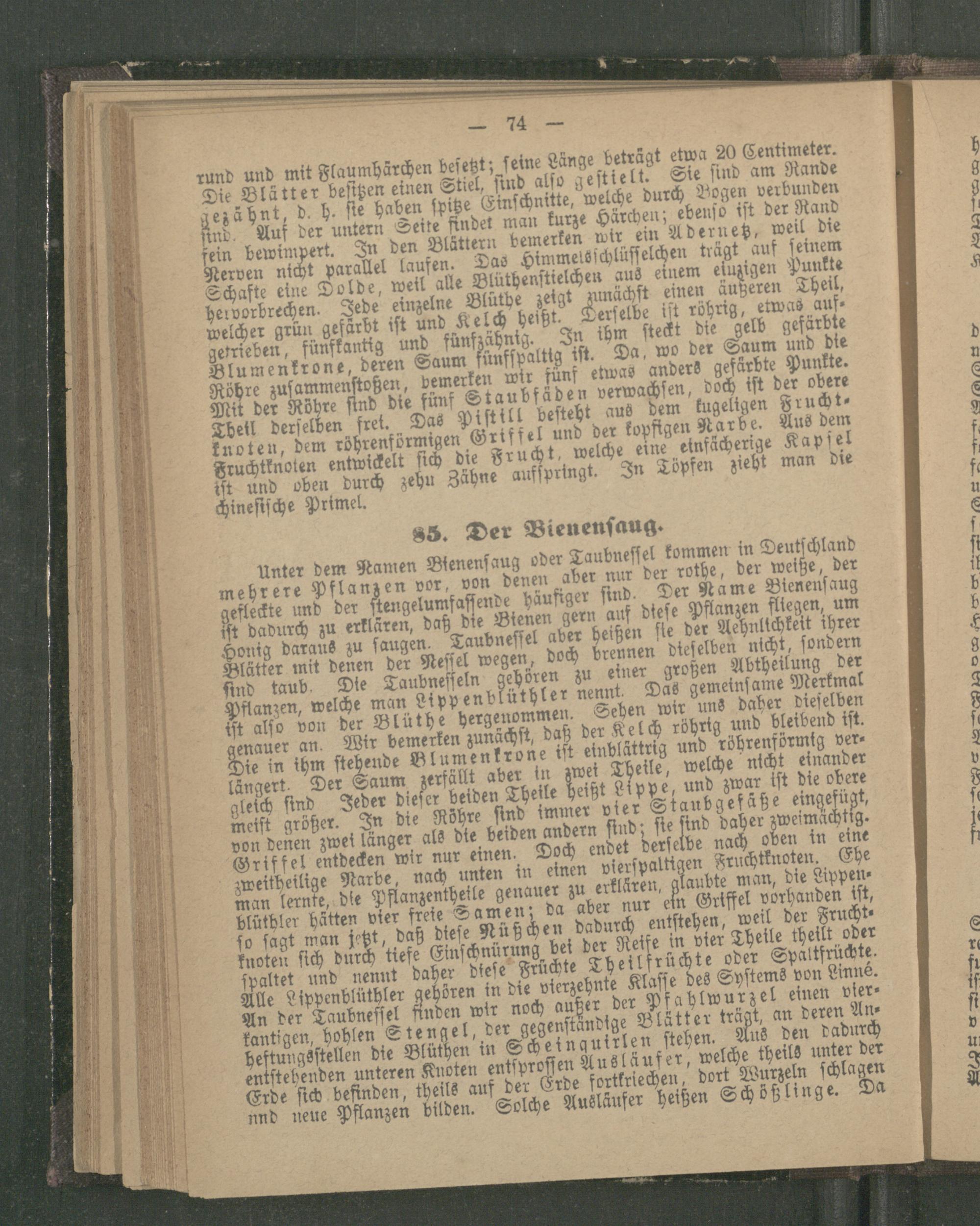 Unter dem Namen Bienenſaug oder Taubneſſel kommen in Deutſchland mehrere Pflanzen vor, von denen Fer nur der rothe, der weiße, der gefleckte und der ſtengelumfaſſende häufiger ſind. Der Name Bienenſaug ſt dadurch zu erklären, daß die Bienen gern auf dieſe Pflanzen fliegen, um Honig daraus zu ſaugen, Taubneffel aber heißen le der Aehnlichkeit ihrer Blätter mit denen der Neffel wegen, doch brennen pieſelben nicht, ſondern find taub. Die Taubneſſeln gehören zu einer großen Abtheilung der Pflanzen, welche man Lipp enbküthler nennt Das gemeinſame Merkmal ſft alfo von der Blüthe hergenommen. Sehen wir uns daher dieſelben genauer an Wir bemerken zunächft, daß der Kelch röhrig und bleibend iſt. Die in ihm ſtehende Blumenkrone iſt einblättrig und röhrenförmig verſängert. Der Saum zerfällt aber in zwei Theile, welche nicht einander gleich ſind Jeder dieſer beiden Theile heißt Lippe, und zwar iſt die obere meift größer. In die Röhre ſind immer vier Staubgefäße eingefügt, von denen zwei länger als die beiden andern fund; fe. daher zweimächtig. Griffel entdecken wir nur einen. Doch endet derſelbe nach oben in eine zweitheilige Narbe, nach unten in einen vierſpaltigen Fruchtknoten. Ehe man lernke, die Pfianzentheile genauer zu erklären, glaubte man, die Lippenplüthler hätten vier freie Samen; da aber nur(n Griffel vorhanden iſt, fo ſagt man jetzt, daß dieſe Nüßchen dadurch entſtehen, weil der Fruchtknoten ſich durch tiefe Einſchnürung bei der Reife in vier Theile theilt oder ſpaltet und nennt daher dieſe Früchte Theilfrüchte oder Spaltfrüchte. Alle Lippenblüthler gehören in die vierzehnte Klaſſe des Syſtems von Linné. An der Taubneſſel finden wir noch außer der Pfahlwurzel einen vierkantigen, hohlen Stengel, der gegenſtůndlg⸗ Blätter trägt, an deren Anheftungsſtellen die Blüthen in Sch einquirlen ſtehen. 918 den dadurch entftehenden unteren Knoten entſproſſen Ausläufer, welche theils unter der Erbe ſich befinden, theils auf der Erde fortkrlechen, dort Wurzeln ſchlagen und neue Pflanzen bilden. Solche Ausläufer heißen Sch ößlinge. Da