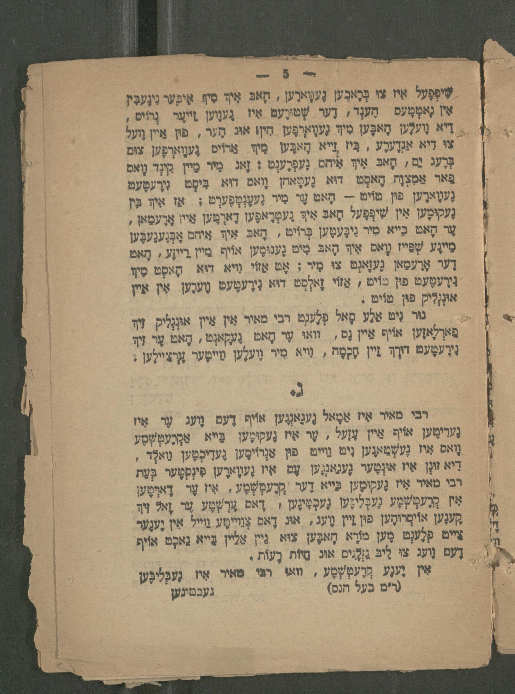 | טור נִיט אַלֶע סָאל פְלֶעגְט רכי מאיר אין אֵיין אנליק זיךְ פַארְלָאזֶען אוֹיף אֵין נָס,. ווא עֶר הָאט. גֶעקָאנְט, הָאט עֶר זי נּדֶעטֶעט דוך? ניין חָכַמָח, נויא סיר וֶועלֶען מֵייטֶער ארציילֶען;