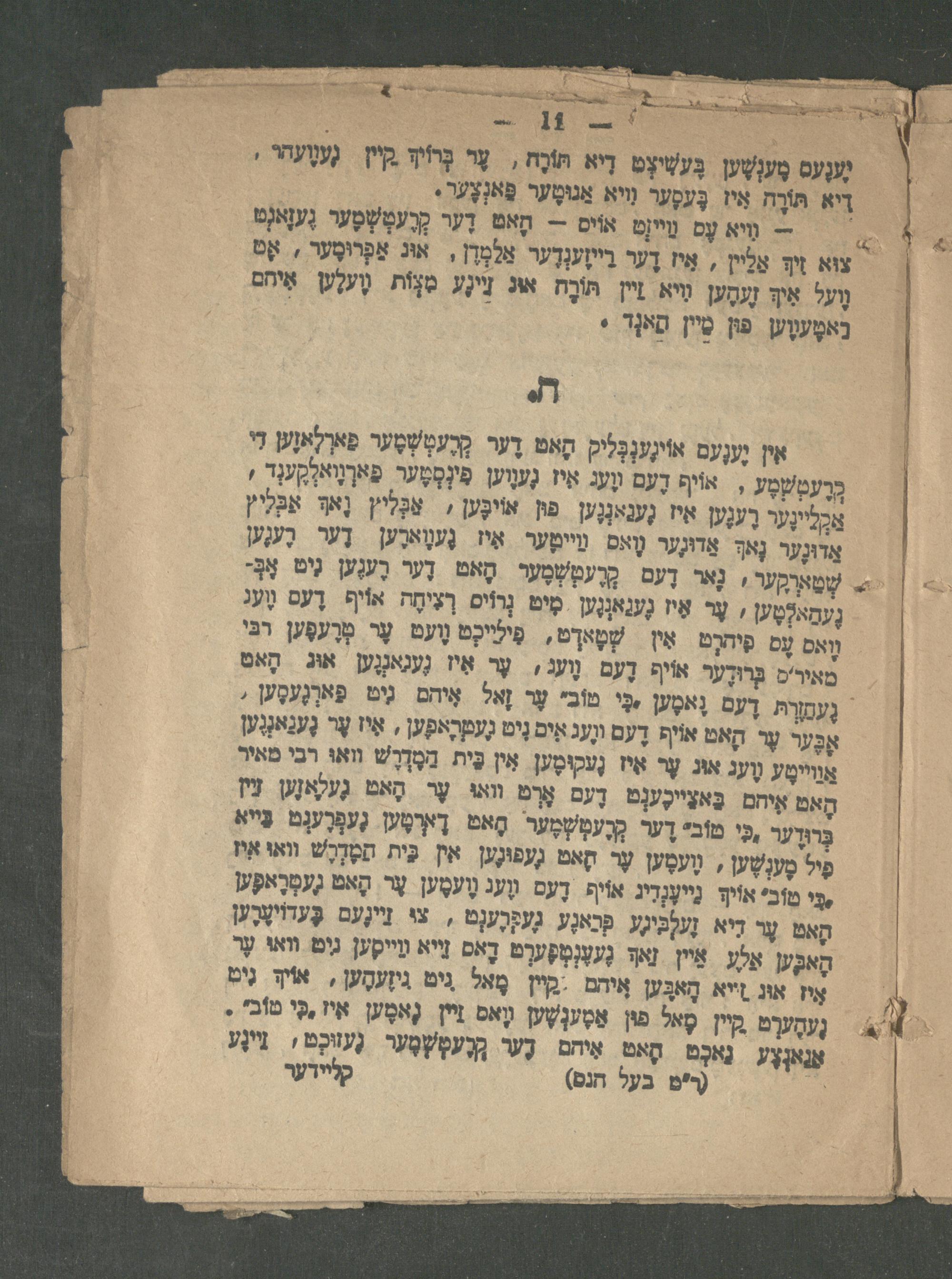 אין וֶענֶעם אוֶֹעְּליק הָא דֶער קָרֶעטְשְׁטֶער פארלאזען די כְרֶעמְשְׁמֶע, אוֹים דֶעם װֶעג איז גֶעוֶוען פִינְמְטֶער. פַארְויאלְקֶענְד! אְַליינֶער רֶענֶען איז גֶענאנְֶען פון אוֹיבֶּען , אַכְּליץ. וָאךּ אבל ץ ו אַדוּנֶער נָאךְ אַרוּנֶער וָואס וַייטֶער אִיז גֶעוַארֶען דֶער רֶענֶען |'+ שְׁטַארְקֶער, נָאר דֶעם קָרֶעטְשְׁמֶער הָאט דֶער רֶענֶען גִיט אָב גֶעחַאלְטֶען/ עֶר אִיז גֶענַאנְגֶען. מִיט נְרוֹיס רְצִיחָה אוֹיף רֶעס גֶעג וָואס עַם פִירְט שְׁטָארְט,. פִייכְט וֶועט עֶר טְרֶעפֶּען רב' מאיר'ם בּרוּדֶער אוֹיף דֶעם נֶועג ,. עֶר אִיז גֶעַאנְגֶען הָאס געמ דֶעם נָאמֶען בִּי מובי עֶר זָאל אֵיהם גִים פַארְגֶעסֶען, אָבֶּער עֶר הָאט אויף דֶעם ונֶעג אִים נִיט גֶעמְרַאפֶען, אִיז שֶר גֶעגַאנְֶען אַוַוייסֶע וֶועג אוג עֶר אִיז גֶעקִיּסֶען אִין בֵּית הַמֶּדְרֶשׁ וואוּ רבי טאיר הָאט איחם בַּצַייכֶעְט דֶעם אָרְט וואו. עֶר. הָאט גֶעלאזֶען יז ְּרודֶער כִּי טוֹבי דֶער קְרֶעטְשְׁמֶער. הָאט. דָארטֶען גֶעפְרֶעגְם בַּי"א פיל מֶענְשֶען, וֶעמֶען עֶר קָאם גֶעפוּנֶען אין בֵּית תִמָדֶֶשׁ וואו איז בי טוֹבי אוֹיך נֵייעֶנְדִיג אויף דֶעס װֶעג נֶועמֶען עֶר. הָאט גֶעטְרָאפֶּען הָאט עֶר דיא זֶעלְבִיֶע פְּרַאנֶע גֶעפְֶעגְט. צי זֵיינֶעם בֶּערוֹשֶרֶען הָאבֶּען אַלע אַיין זאך גֶעעֶנְמְפֶּערְט דָאס זַייא וַייקֶען ני. ווא עֶר איז און זייא הָאבֶּען אֶיהם:קיין מָּאל נִיט גִיזֶעהֶען, אויך. נִיט