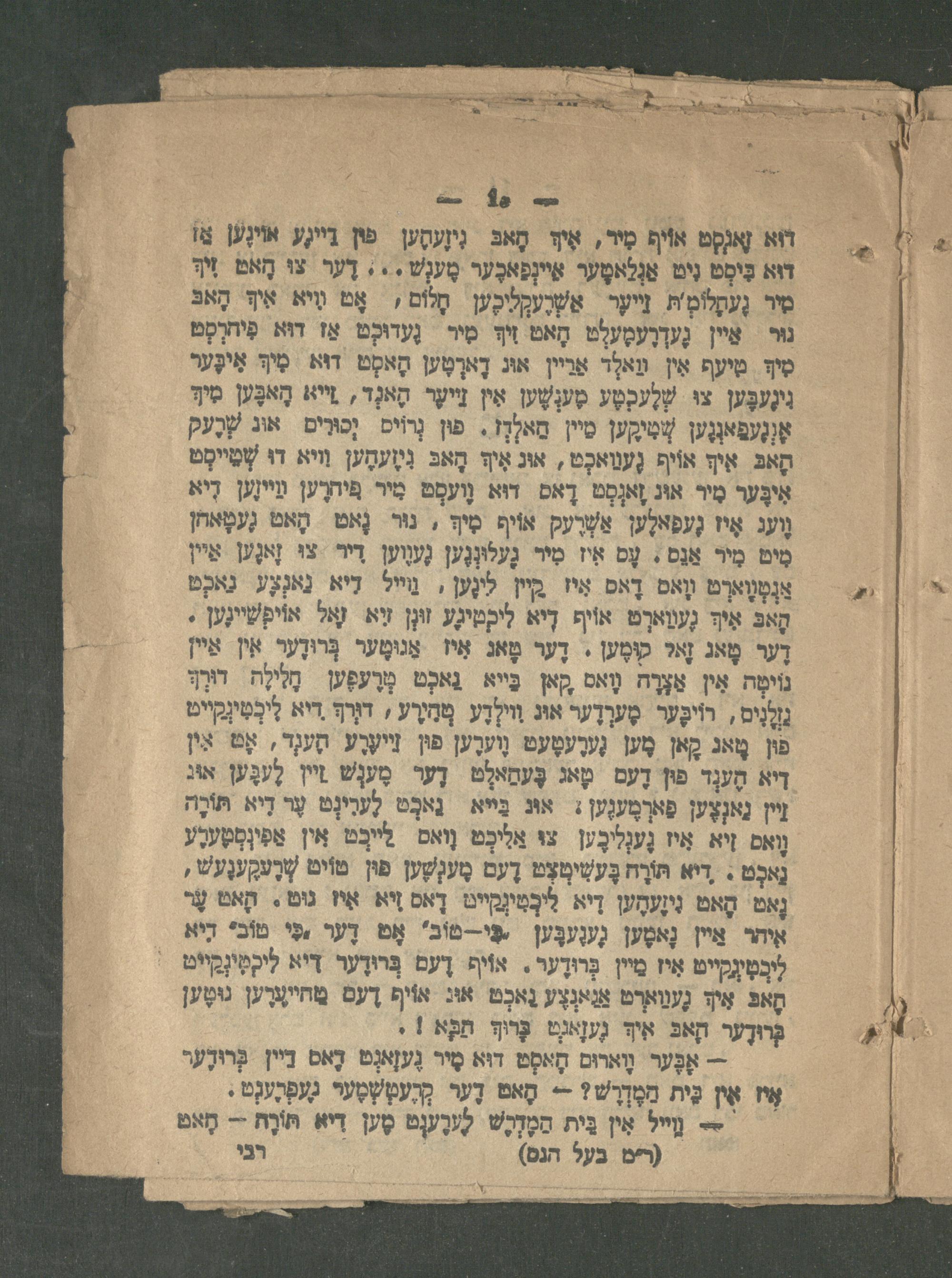 הא זָאנְסְט אוֹיף מִיר, אִי קָאבּ גִיזֶעקֶען פון בֵייגֶע אוֹינֶען אַז דוא בֵּיסְט נִיט אַנְלַאסֶער אֵיינְפַאכֶער מֶענְשׁ... דֶער צו הָאט זִיך מיר גֶעתְלוֹמ"א חָלוֹם/- אָט װִיא אִיך הָאבּ נור אַין גֶעדְרֶעמֶעלְט הָאט זִיךְּ גֶעדוּכְט אַז דוּא פִיהרְסְט מִי. טיעף עַאלְד אַרײן אוּג דָארְטֶען הָאסְט דוּא מִיךְּ אִיבֶּער ִינֶעבֶּען צוּ שְׁלֶעכְטֶע מֶענְשֶׁען אִין זֵיעֶר הָאנְד, זיא הָאבֶּען מִיךָ אָנְגֶעפַּאנְגֶען שְמִיקֶען סיין חַאלְרָו. פון נְרוֹים. אוג שָׁרֶעק חָאבּ איף אוֹיף גֶעואכְט, אונ אִיף הָאבּ נִמֶעהֶען ויא דו שְׁמֵייסְט אִיבֶּער מִיר אוּג זָאנְסְט דָאס דוא וֶועסְט מִיר פִיהרֶען וַיינֶען רִיא וֶועג אָי גֶעפַאלֶען אַשְׁרֶעק אוֹיף מִיךָ, נור גָאט הָאט גֶעטָּאהֹן מִיט מִירֹ אַנס. עֶס אִיז מִיר גֶעלוּנְגֶען גֶעוֶוען דיר צוּ זָאנֶען אֵיין ַנְטְוַארְט וָאס דָאס קֵיין לינֶען, גייל דיא נַאכְט הָאבּ אִיךְ גֶעוַארְט אוֹיף דיא ליקטיגֶע זנן זיא(ָאל אוֹיפְשִׁיגֶען. דֶער טָאג זָאל קוּמֶען. דֶער טָאג אִיז אַנוּטֶער בְּרוּדֶער אין אַיין נוֹימָּה אִין אַצְרָה װָאס קאן בַּייא גַאכְט חֲלֵילָה- דוּרֶף לְנִים, רוֹיֶּער טֶערְדֶער אוג וִוילְדֶע פְחַיֶע, דוָרף.דיא לִיכְטִינְקֵייט פון טָאג קָאן מֶען גֶערֶעטֶעט וֶוערֶען פון זֵייערֶע הֶעגֶד, אָט אין דיא הֶענְד פון דֶעם מָאג בֶּעחַאלְט דֶער מֶענְשׁ זיין לֶעבֶּען אוג זיין נַאנְצֶען פַארְמֶענֶען אוג בַּייא נַאכְט לֶערִינְט עֶר דִיא תּוֹרָה וָאם זִיא אִיז גֶענְלְכֶען צו אַלֵיכְט לֵייבְּט אין אַפִיְמְטֶעלֶע נַאכְט. דיא תּוֹרֶהבֶּעשִׁימְצְט דֶעם מֶעגְשֶׁען פוּן טּוֹיט שְׁרֶעקֶענֶעשׁ, נָאם הָאט נִיזֶעהֶען דִיא. לִיכְמִיְקֵייט דָאס זִיא אִיז גוט. הָאט עֶר איחר אֵיין נָאטֶען גֶענֶעבֶּען בִּי--טוֹב' אָט דֶער ככִּי טוֹבי דִיא לִכְטִיגְקֵייט אִיז מיין בְרוּדֶער. אוֹיף דֶעםֹ בְּרוּדֶער דיא ליקטִינקייט חָאבּ אִיך גֶעוַוארְט אַנַאנְצֶע נַאכְטּ אוּג אוֹיף דֶעם מַחייערֶען גוּטֶען ְּרוּדֶער אב איף גֶעזָאגְט בָּחוךְּ תַכָּא!.