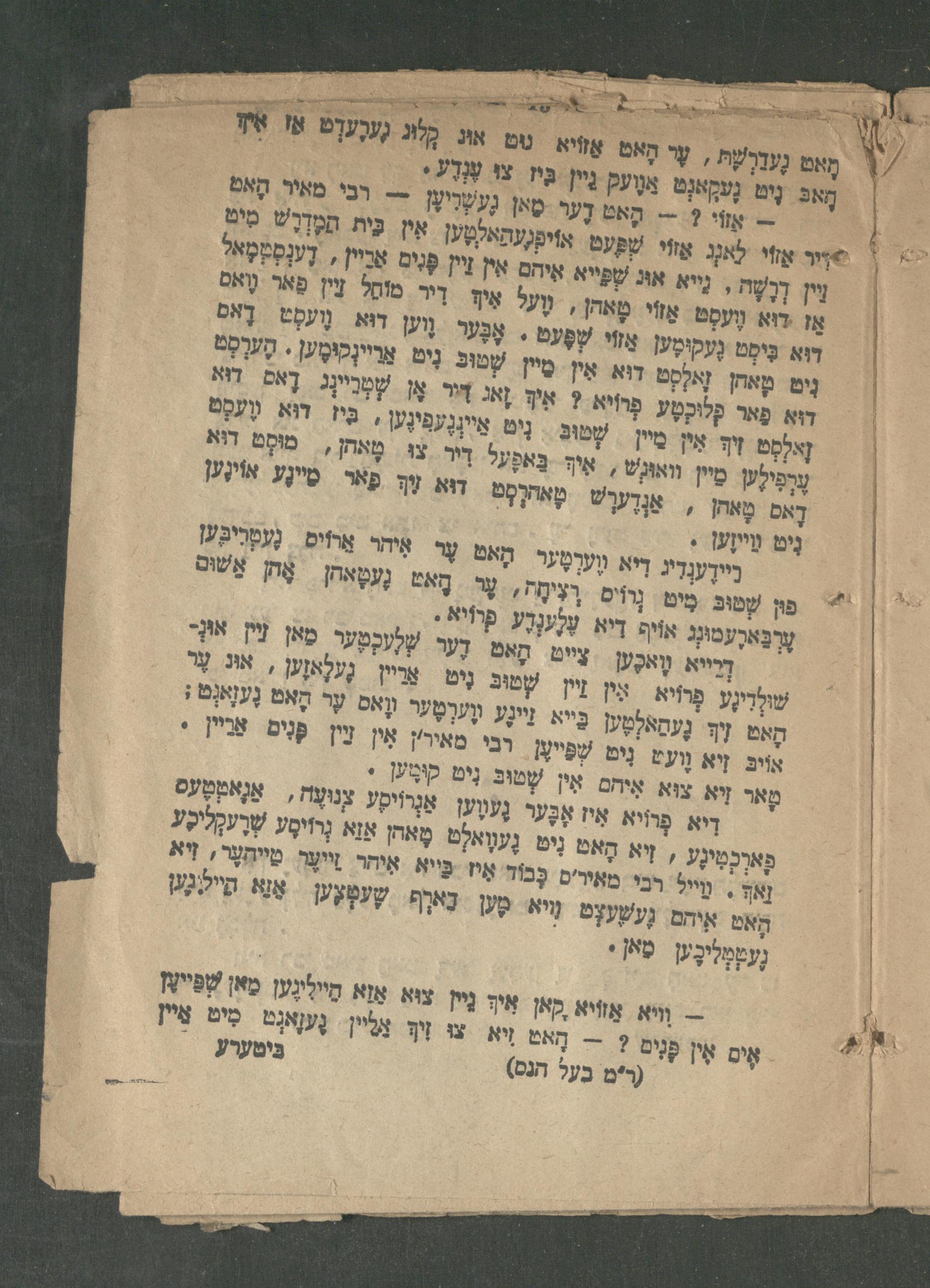 הָאט גֶעדַרְשָׁהּ, עֶר הָאט אַזויא ניט און קלוּן גֶעגֶערְט אז אין הָאבּ נִיט גֶעקָאנְט אַוֶועק גִיין ביז צו עֶנְדֶע. רבי מאיר הָאט אַזוי?- הָאט דֶער מאן גֶעשְׁרִיעֶן יר אַזוי לאנג אַזוֹי שְׁפּעט אויפגעהאלטען אִין בֵּית הַמִּדְרָשׁ מִיט זַיין דְרָשָׁה, גֵייא אוּן שְׁטֵייא איהם אין זַיין פָּנִים אַרַיין, דֶענְסְטְמָאל אז דוּא וֶועסְט אַזוֹי טָאהן, וֶועל אִיךְ דִיר מוֹחַל זַיין פַאר וָואס דוּא בִּיסְט גֶעקוּמֶען אַזוי שְׁפּעט. אָבֶּער וֶוען דוא וֶועסְט דָאס ניט טאהן זָאלְסְט דוא אין מיין שְׁטוּב נִיט אַרַיינְקוּמֶען. הֶערְסְט דוא פאר כָּלוּכְטֶע פְרוֹיא? אִיךְ זָאג דִיר אָן שְׁטְרַיינְג דָאס דוא זָאלְסְט זִיךְ אִין מִיין שְׁטוּב נִיט זֵיינְגֶעפִיגֶען, ביז דוּא וֶועסְט עֶרְפִילֶען מיין וואוּנְשׁ, אִיךְ בָּאפֶעל דִיר צו טָאהן. מוּסְט דוּא אַנְדֶערְשׁ טָארְסְט דוא זיך פאר מיינע אויגען דָאס טָאהן,