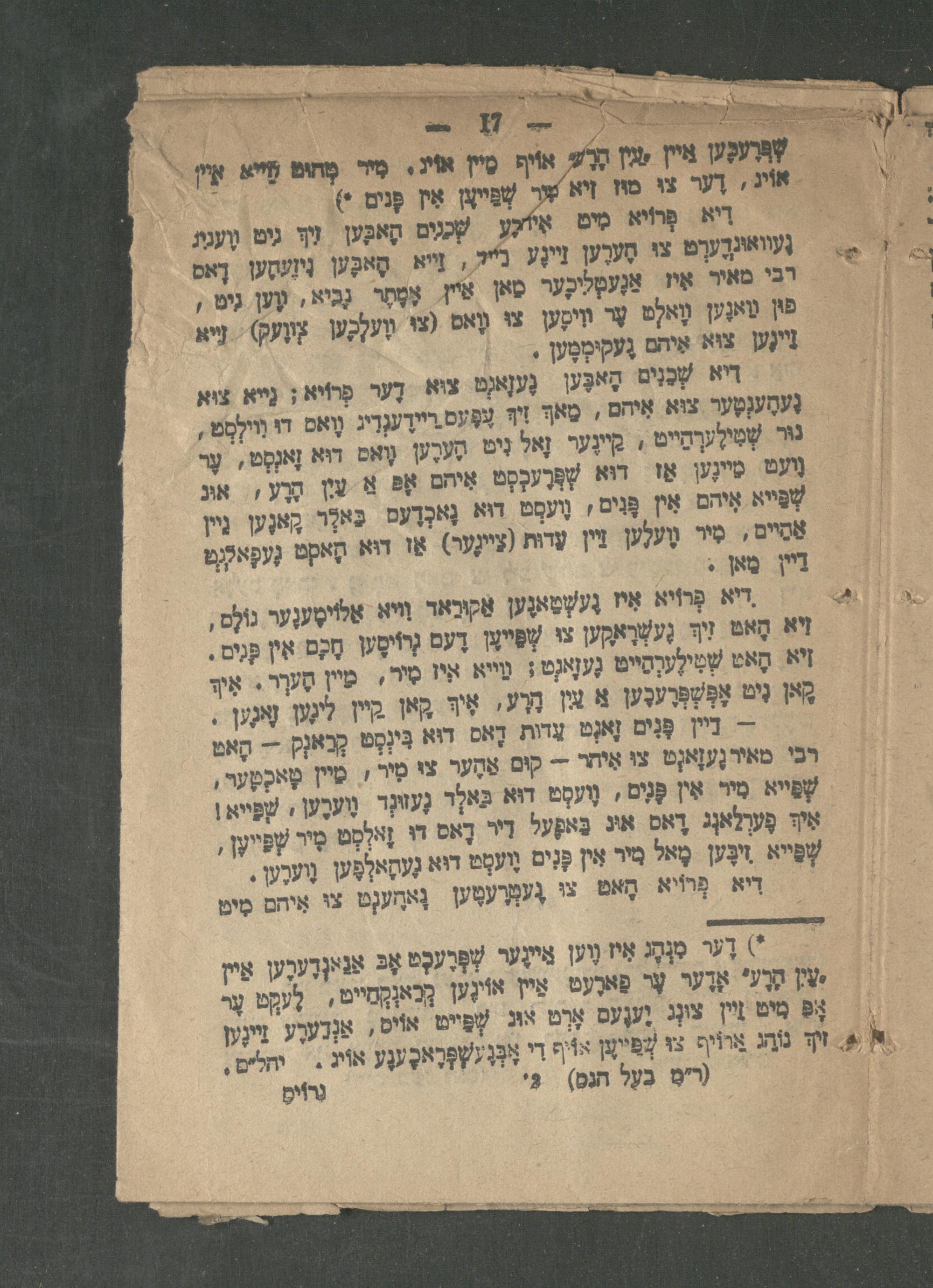 שְׁפְּרֶעגֶען איין ין הָרָע אויף מיין אויג. מיר טהוט וויא איין אוין, דֶער צו מון זיא מיר שְׁפַייעֶן אִין פּנים*) הִיא פְּרוֹיא מיט איהרע שְׁבָנִים הָאבּען זיך ניט וועניג געוואוּנְדֶערְט צוּ הֶערֶען זֵיינע בייל, זֵייא הָאבֶּען גִיזֶעדען דָאס רבי מאיר אִיז אַגֶעטְלִיכֶער מאן איין אָמָתָר נָבִיא, ווען ניט, פון וַואנֶען וָואלְט עֶר וִוימֶען צו וואס( צוּ וֶועלְכֶען צוועק) זייא זיינען צוא איהם גֶעקוּמְמֶען• דיא שְׁבָנִים הָאבֶּען גֶעזָאגְט צוּא דֶער פרויא; נייא צוא גֶעהֶענְטְער צוּא אִיהם, מַאךְ זִיךְ עֶפּעס רַיידֶענְדִין וָואס דוּ וִוילְסְט נוּר שְׁטִילֶערְהַייט, קיינֶער זָאל נִיט הֶערֶען וָואס דוּא זָאנְסְט, עֶר וֶועט מיינֶען אַז דוּא שְׁפְּרֶעכְסְט אִיהם אָפּ אַ עַיִן הָרָע, און שְׁבַּייא איהם אִין פָּנִים, וֶועסְט דוּא נָאכְדֶעם בַּאלְר קאנען ניין אַחַיים, מִיר וֶועלען זיין עדות( צייגער) אז דוא האסט געפאלגט