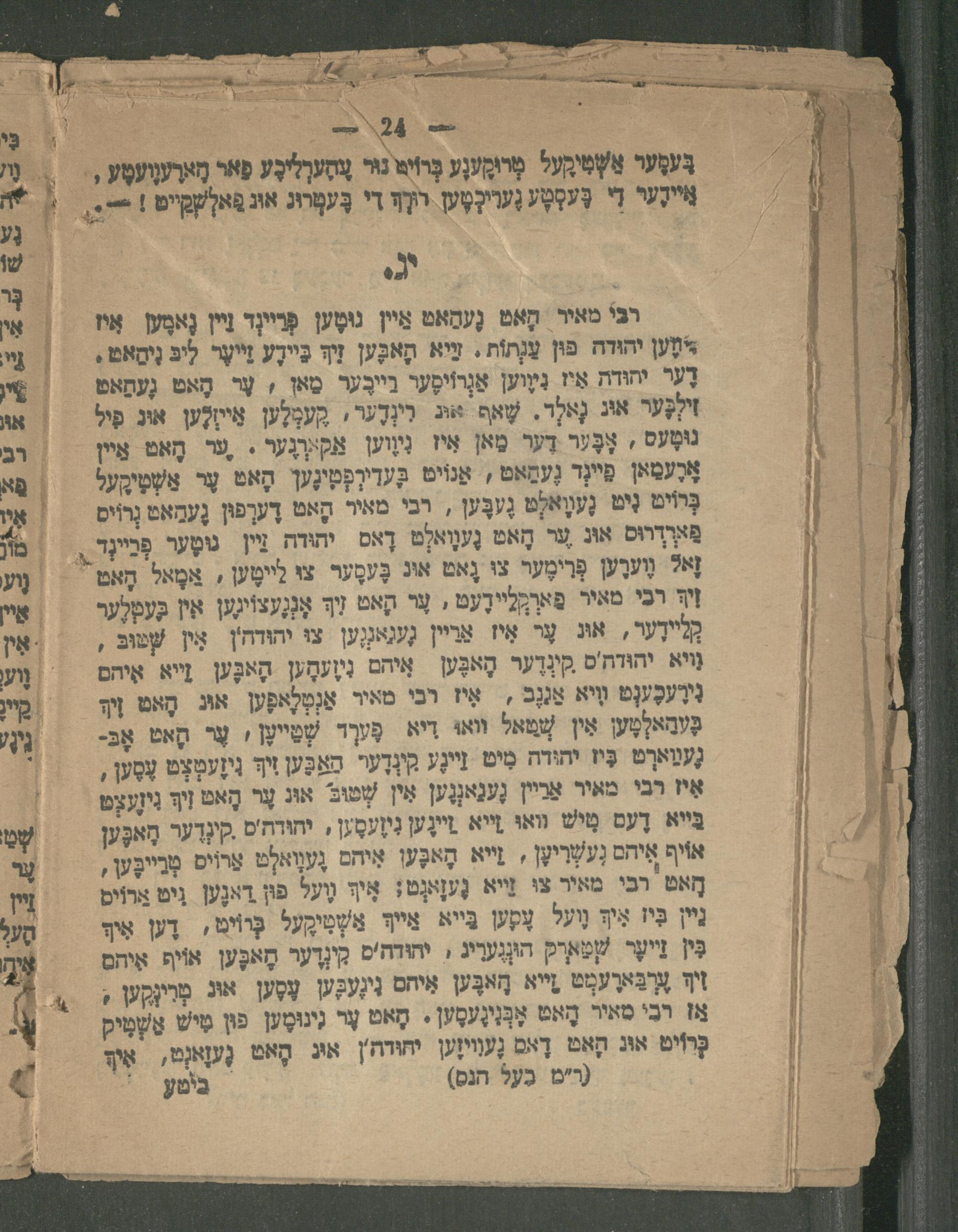 רב מאיר. חָאט גֶעהַאט אֵיין נוּמֶען פְריינְד נַיין נָאמֶען אִיז +מֶען יהודה פון עַנָתוֹת. זַא הָאבֶּען זִךְ בֵיידֶע זֵייעֶר ליב נִיהַאט, דֶער יתודת אִיז נטֶוען אַנְרוֹיסֶער בייבער סאן, עֶר הָאט גֶעחַאט זיכֶּער אוג גָאלֶר. שָׁאף. אוג. רִינְדֶער, קֶעמְלֶען אֵייְלֶען איג מִּיל נוּטֶעס צְבֶּער דֶער פאן אִיז נִיוֶוען אַקאָער. ,ער הָאט אֵיין אָנֶעטאן פַיינָד גֶעמַאט, אַנוֹיט בֶּעדִירְפְִינֶען הָאט עֶר אַשְׁטִיקֶעל בּרוֹיט נִיט גֶעמָאלְט גֶעבֶּען, רבי מאיר הָאט דֶערְפוּן גֶעמַאט נְרוֹים פארדרוס ער הָאט גֶעוָאלְט דָאס. יתורה נוּטֶער פְרַייְד