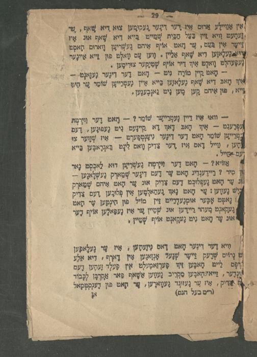 - וואוּ אִיז דיין נֶעמְרֵייעֶר שׁוֹמַר?= חָאט דֶער וְיֶמֶתּ פְרֶעגְט= אִיךְ הָאבּ דָאךְ דָא קֵיינֶעם נִיט גֶעפּגֶען, דֶעם טריין שׁוֹמר הָאט דֶער דִינֶער גִיענְטְפֶערְט== אִיז שְׁוֶוער צי מֶען 4 מייל דָאס איז דער צדיק וָואס לונ בַּאְרָאבֶען בַּייא וֶעם םייל. : אַזֹיא?- הָאט דֶער חִיֶרטָח גֶעשְׂרַען דוא לָאכְסְט נָאר / מִיר? בֵיירֶענְדִיג הָאט עֶר דֶעם דער שְׁמַארְק גֶעשְׁלַאנֶען--1 עֶר הָאט גֶעפְלוּכְט דֶעם צֵרִיק אוג עָר הָאט אִיהם שְׁטַּארְק ֶשׁ גֶעֶען: אי הָאט נָאך גֶעסַאלְמֶען אִין פְלוּבֶען ,דע צָרִיק ! נָאטְט אָבֶּער אוּמְגֶעדְרֵייט זיין מוֹיל פון הִינְטֶען שֶר הָאט גֶעקַאנְט מֶעהר יידען אוג שְׁמַיין ער אִיז גֶעפָאלֶען אוֹיף דֶער אוּג עֶר הָאט נִיט גֶעקָאנְט אוֹיף שְׁטַיין'