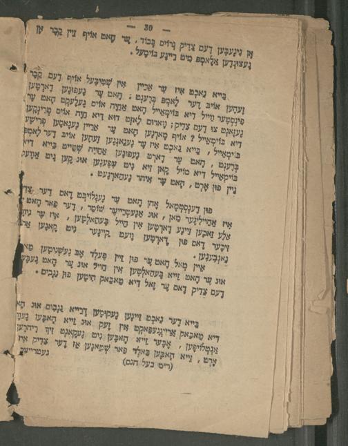 איין מאל הָאט עֶר פון זיין מֶעלְךְ אָב גֶעשְׁנִיטֶען טא אוּן עֶר הָאט זֵייא גֶעהַאלְטֶען אין מייל אוּן עֶר הָאט גֶעבֶּץ דֶעם צַדִיק דָאס עֶר זָאל דיא טאבאק הִיטְען פון גנבים•