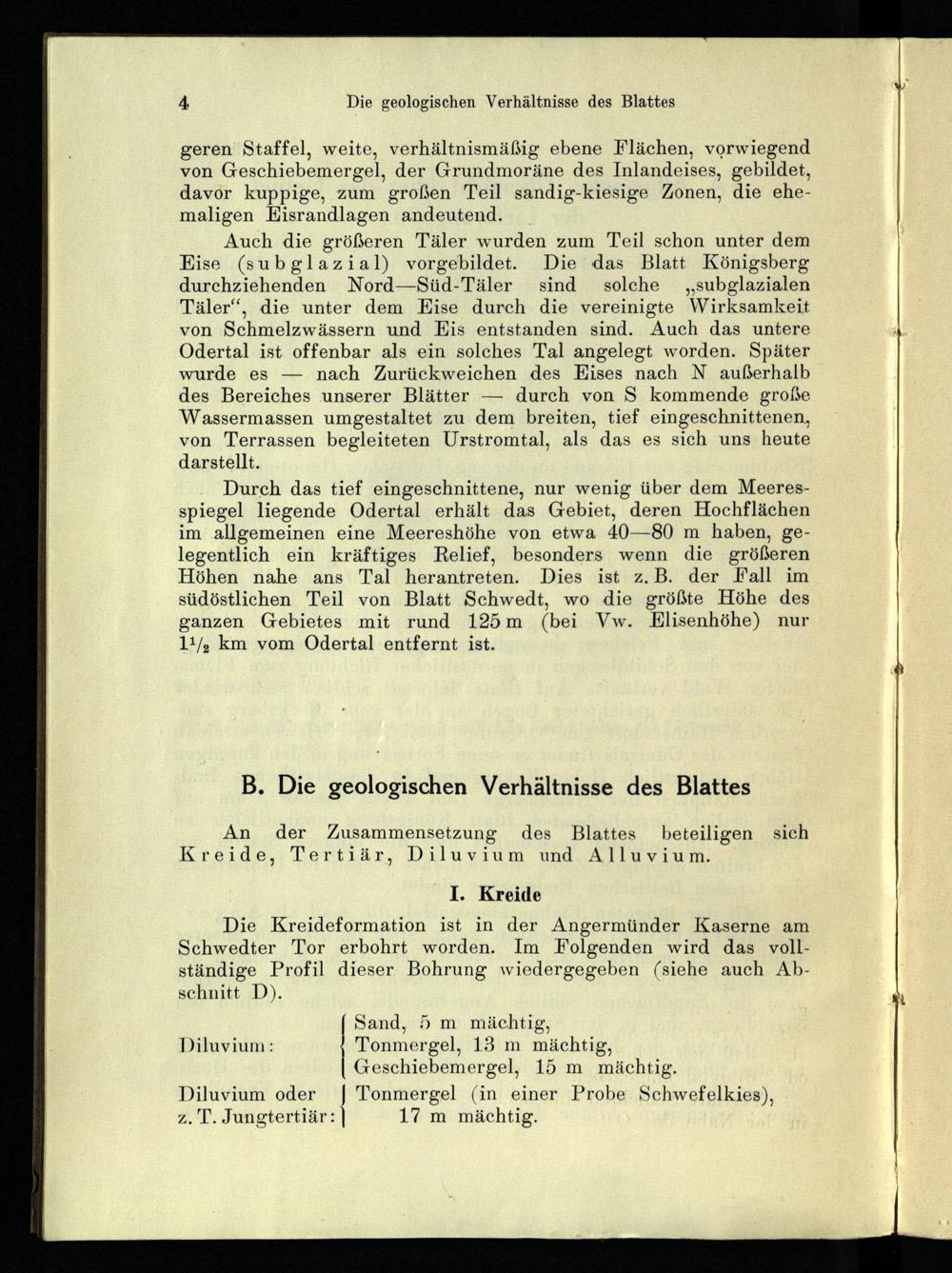 Durch das tief eingeschnittene, nur wenig über dem Meeresspiegel liegende Odertal erhält das Gebiet, deren Hochflächen im allgemeinen eine Meereshöhe von etwa 40—80 m haben, gelegentlich ein kräftiges Relief, besonders wenn die größeren Höhen nahe ans Tal herantreten. Dies ist z.B. der Fall im südöstlichen Teil von Blatt Schwedt, wo die größte Höhe des ganzen Gebietes mit rund 125m(bei Vw. HElisenhöhe) nur 11/2 km vom Odertal entfernt ist.
