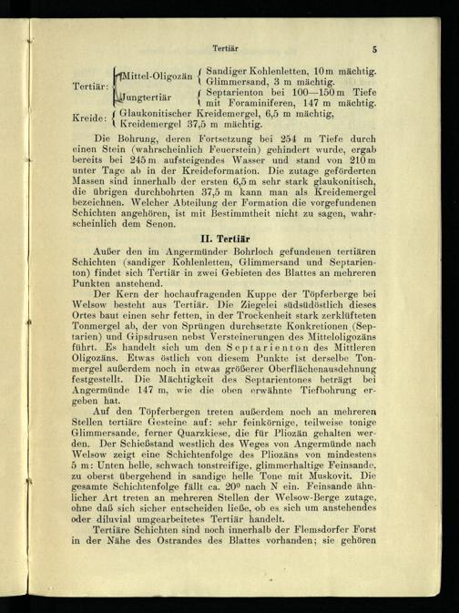 Außer den im Angermünder Bohrloch gefundenen tertiären Schichten(sandiger Kohlenletten, Glimmersand und Septarienton) findet sich Tertiär in zwei Gebieten des Blattes an mehreren Punkten anstehend.|