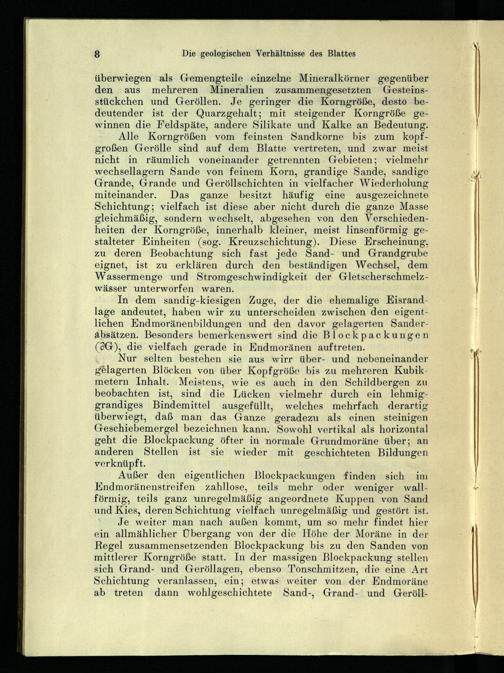 Alle Korngrößen vom feinsten Sandkorne bis zum kopfgroßen Gerölle sind auf dem Blatte vertreten, und zwar meist nicht in räumlich voneinander getrennten Gebieten; vielmehr wechsellagern Sande von feinem Korn, grandige Sande, sandige Grande, Grande und Geröllschichten in vielfacher Wiederholung miteinander. Das ganze besitzt häufig eine ausgezeichnete Schichtung; vielfach ist diese aber nicht durch die ganze Masse gleichmäßig, sondern wechselt, abgesehen von den Verschiedenheiten der Korngröße, innerhalb kleiner, meist linsenförmig gestalteter Einheiten(sog. Kreuzschichtung). Diese Erscheinung, zu deren Beobachtung sich fast jede Sand- und Grandgrube eignet, ist zu erklären durch den beständigen Wechsel, dem Wassermenge und Stromgeschwindigkeit der. Gletscherschmelzwässer unterworfen waren.