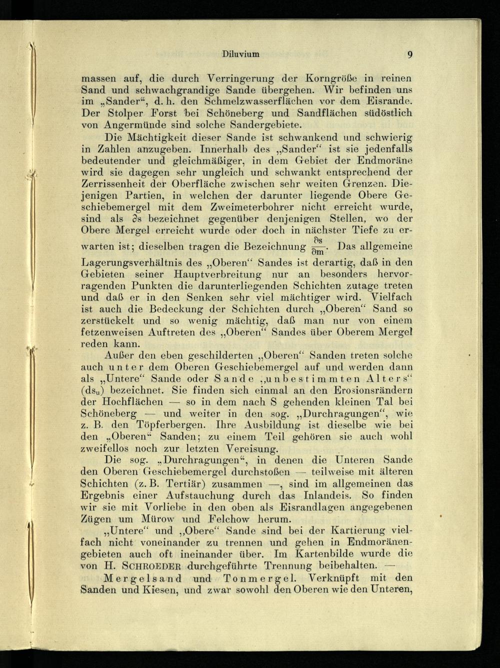 „Untere“ und„Obere“ Sande sind bei der Kartierung vielfach nicht voneinander zu trennen und gehen in Endmoränengebieten auch oft ineinander über. Im Kartenbilde wurde die von H. SCHROEDER durchgeführte Trennung beibehalten.—