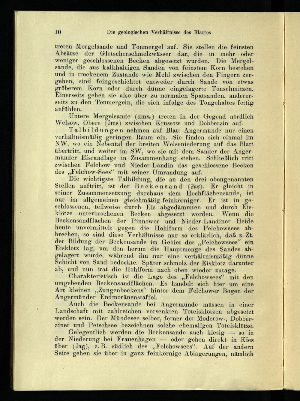 Talbildungen nehmen auf Blatt Angermünde nur einen verhältnismäßig geringen Raum ein. Sie finden sich einmal im NW, wo ein Nebental der breiten Welseniederung auf das Blatt übertritt, und weiter im SW, wo sie mit dem Sander der Angermünder KEisrandlage in Zusammenhang stehen. Schließlich tritt zwischen Felchow und Nieder-Landin das geschlossene Becken des„Felchow-Sees‘ mit seiner Umrandung auf.