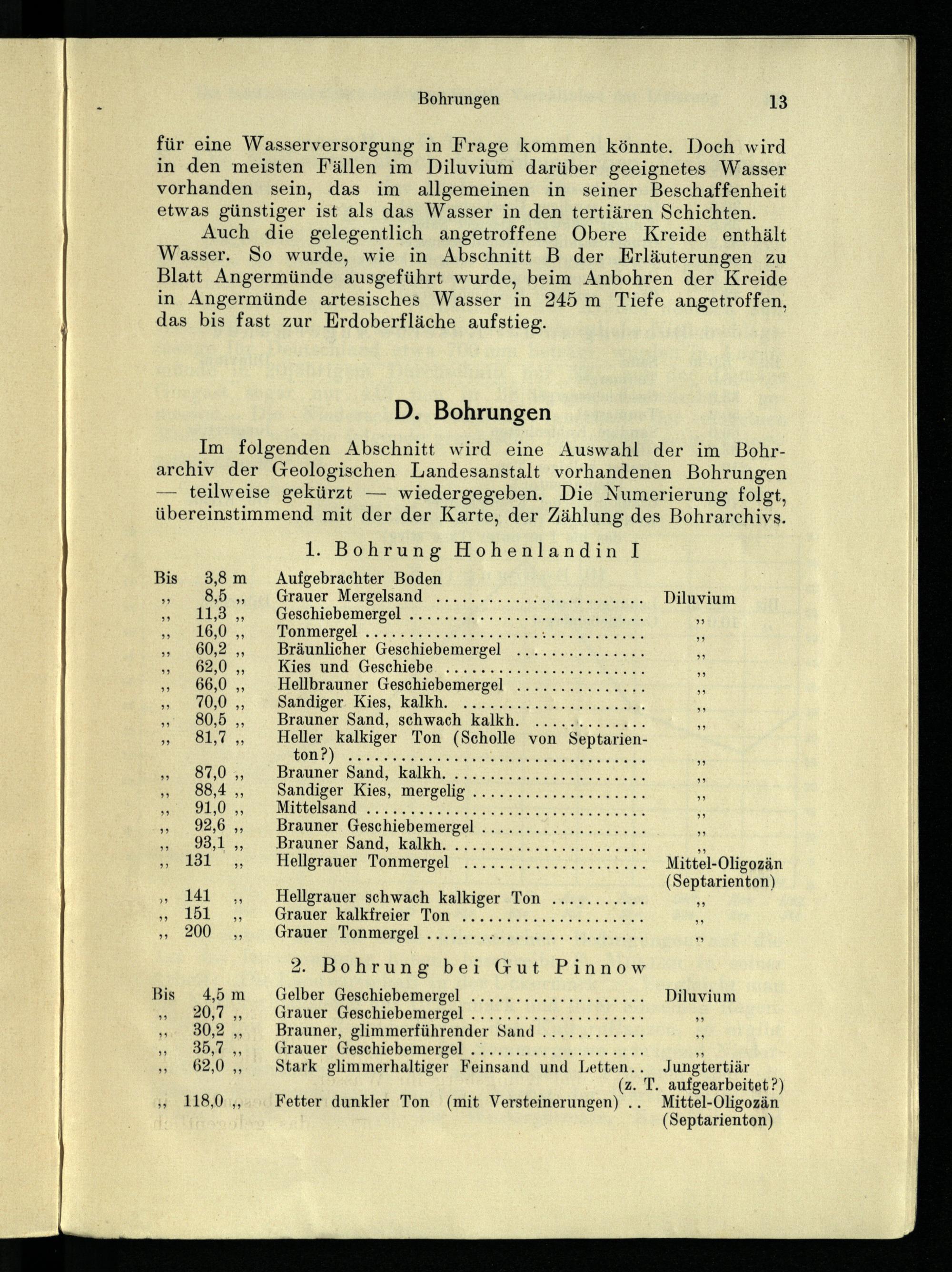 Auch die gelegentlich angetroffene Obere Kreide enthält Wasser. So wurde, wie in Abschnitt B der Erläuterungen zu Blatt Angermünde ausgeführt wurde, beim Anbohren der Kreide in Angermünde artesisches Wasser in 245 m Tiefe angetroffen, das bis fast zur Erdoberfläche aufstieg.