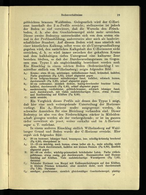 gebleichten braunen Waldböden. Gelegentlich wird der C-Horizont innerhalb des 2 m-Profils erreicht; stellenweise ist jedoch der Boden so tief verwittert, daß die Wurzeln den Frischboden, d. h. also den Geschiebemergel nicht mehr. erreichen. Dieser zweite Bodentyp unterscheidet sich von dem ersten einmal in der Profilausbildung, andererseits aber auch als landwirtschaftlicher Standort. Auf diesem Boden wird man nämlich mit einer künstlichen Kalkung, selbst wenn sie als Untergrundkalkung gegeben wird, den natürlichen Kalkgehalt des C-Horizontes nicht erreichen, d. h. es wird immer zwischen der gekalkten Krume und dem kalkhaltigen tiefen Untergrund eine kalkarme Zone bestehen bleiben, so daß der Durchwurzelungsraum im Gegensatz zum Typus 1 als ungleichmäßig bezeichnet werden muß. Ein Einschlag in einem solchen Boden(Bodeneinschlag I unmittelbar südlich von Wilhelmsberg) zeigte folgendes Bild: