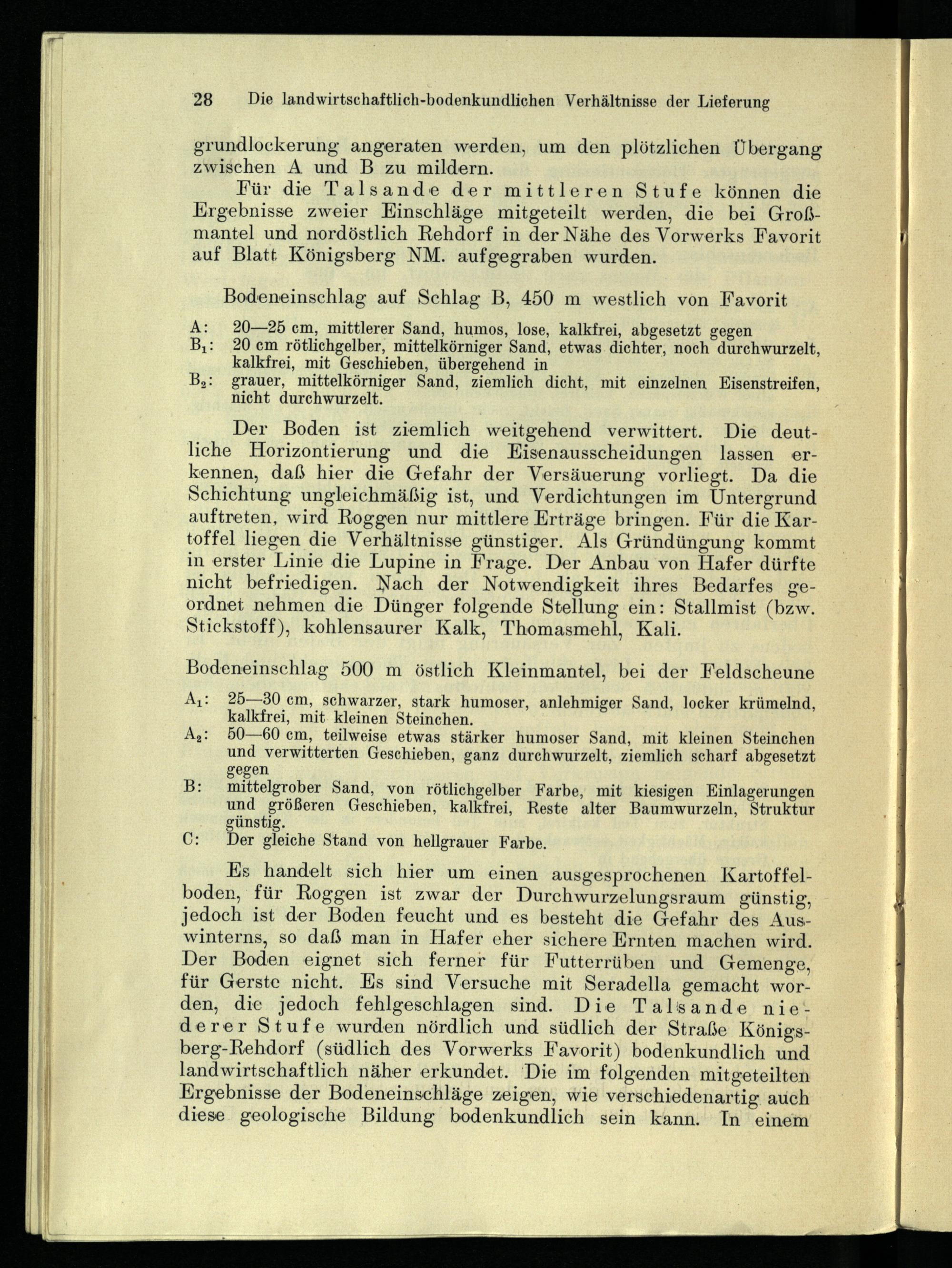 Es handelt sich hier um einen ausgesprochenen. Kartoffelboden, für Roggen ist zwar der Durchwurzelungsraum günstig, jedoch ist der Boden feucht und es besteht die Gefahr des Auswinterns, so daß man in Hafer eher sichere Ernten machen wird. Der Boden eignet sich ferner für Futterrüben und Gemenge, für Gerste nicht. Es sind Versuche mit Seradella gemacht worden, die jedoch fehlgeschlagen sind. Die Talsande niederer Stufe wurden nördlich und südlich der Straße Königsberg-Rehdorf(südlich des Vorwerks Favorit) bodenkundlich und landwirtschaftlich näher erkundet.‘Die im folgenden mitgeteilten Ergebnisse der Bodeneinschläge zeigen, wie verschiedenartig auch diese. geologische Bildung bodenkundlich sein kann. In einem