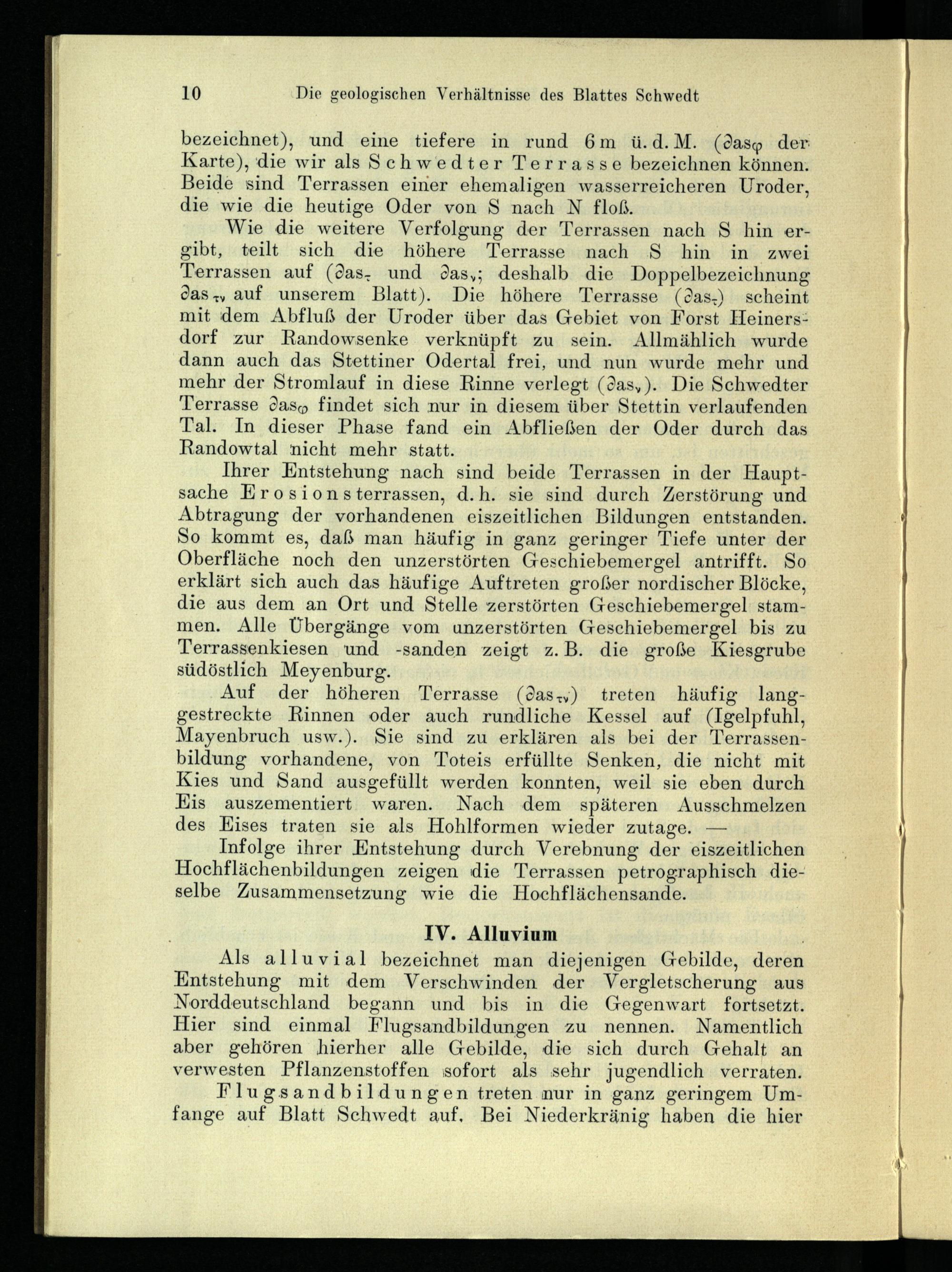Wie die weitere Verfolgung der Terrassen nach S hin ergibt, teilt sich die höhere Terrasse nach S hin in zwei Terrassen auf(das. und das,; deshalb die Doppelbezeichnung das, auf unserem Blatt). Die höhere Terrasse(das-) scheint mit dem Abfluß der Uroder über das Gebiet von Forst Heinersdorf zur Randowsenke verknüpft zu sein. Allmählich wurde dann auch das Stettiner Odertal frei, und nun wurde mehr und mehr der Stromlauf in diese Rinne verlegt(das,). Die Schwedter Terrasse dasgy findet sich nur in diesem über Stettin verlaufenden Tal. In dieser Phase fand ein Abfließen der Oder durch das Randowtal nicht mehr statt.