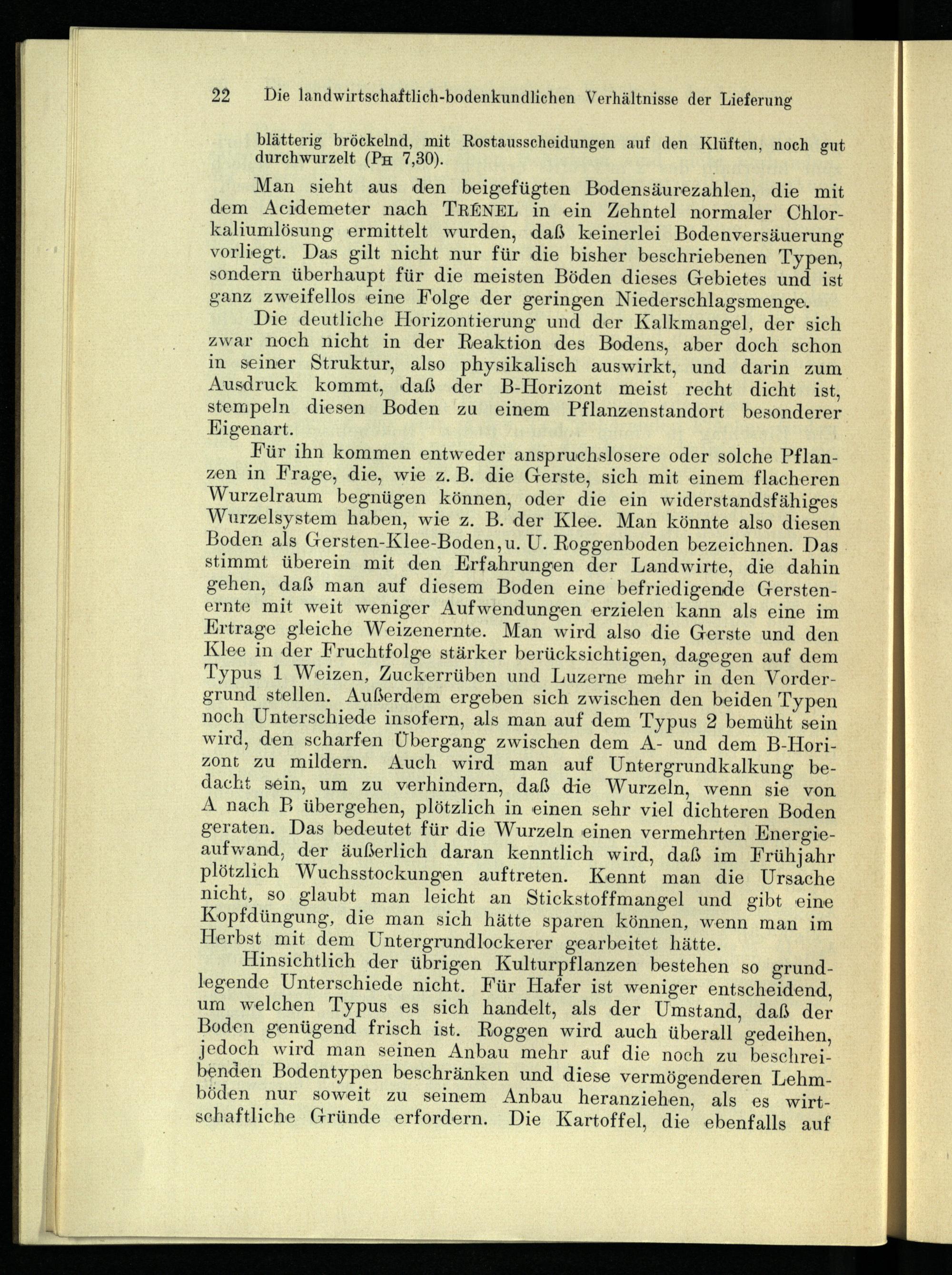 Für ihn kommen entweder anspruchslosere oder solche Pflanzen in Frage, die, wie z.B. die Gerste, sich mit einem flacheren Wurzelraum begnügen können, oder die ein widerstandsfähiges Wurzelsystem haben, wie z. B. der Klee. Man könnte also diesen Boden als Gersten-Klee-Boden, u. U. Roggenboden bezeichnen. Das stimmt überein mit den Erfahrungen der Landwirte, die dahin gehen, daß man auf diesem Boden eine befriedigende Gerstenernte mit weit weniger Aufwendungen erzielen kann als eine im Ertrage gleiche Weizenernte. Man wird also die Gerste und den Klee in der Fruchtfolge stärker berücksichtigen, dagegen auf dem Typus 1 Weizen, Zuckerrüben und Luzerne mehr in den Vordergrund stellen. Außerdem ergeben sich zwischen den beiden Typen noch Unterschiede insofern, als man auf dem Typus 2 bemüht sein wird, den scharfen Übergang zwischen dem A- und dem B-Horizont zu mildern. Auch wird man auf Untergrundkalkung bedacht sein, um zu verhindern, daß die Wurzeln, wenn sie von A nach RB übergehen, plötzlich in einen sehr viel dichteren Boden geraten. Das bedeutet für die Wurzeln einen vermehrten Energieaufwand, der äußerlich daran kenntlich wird, daß im Frühjahr plötzlich Wuchsstockungen auftreten. Kennt man die Ursache nicht, so glaubt man leicht an Stickstoffmangel und gibt eine Kopfdüngung, die man sich hätte sparen können, wenn man im Herbst mit dem Untergrundlockerer gearbeitet hätte.