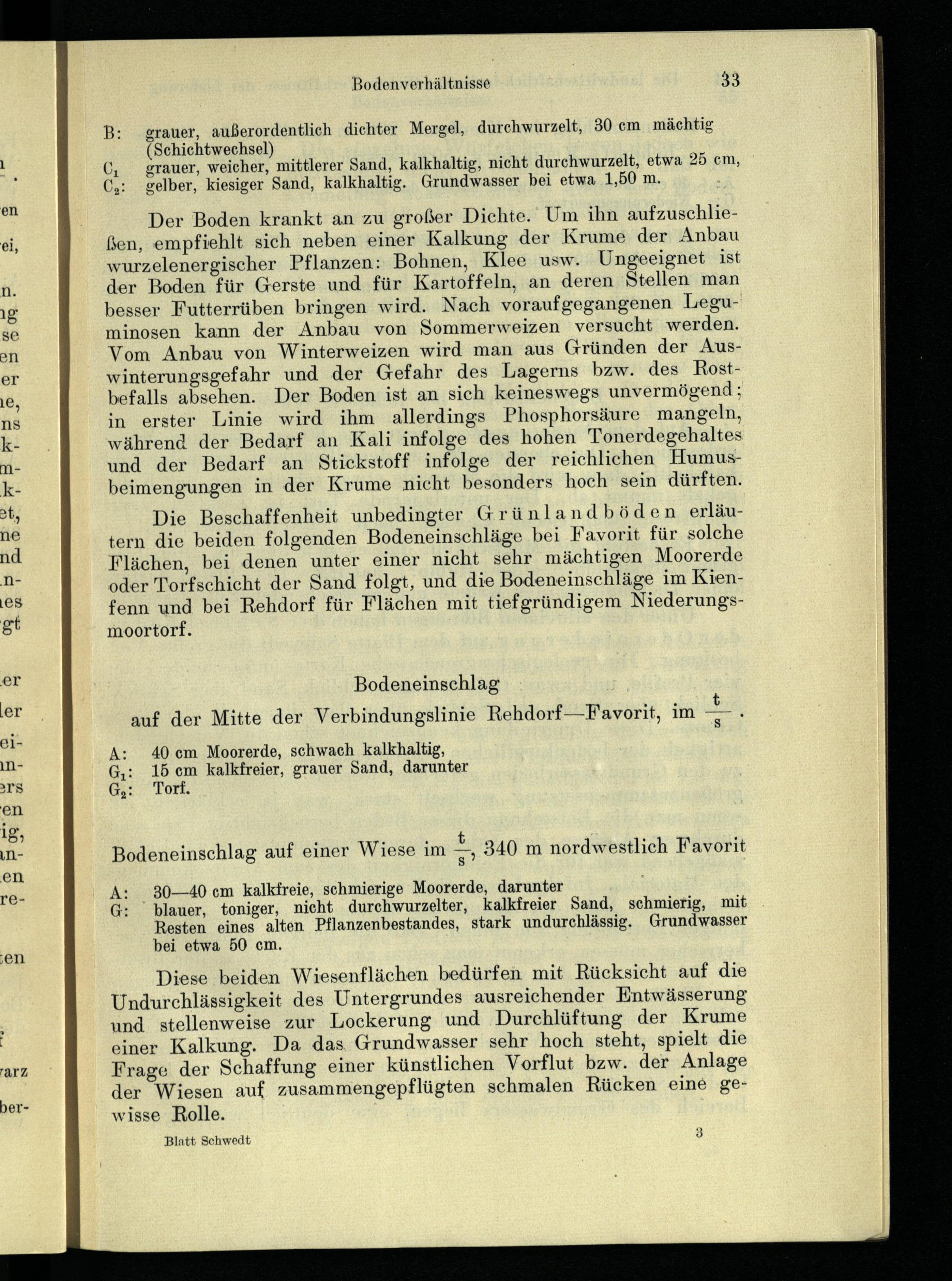 Die Beschaffenheit unbedingter Grünlandböden erläutern die beiden folgenden Bodeneinschläge bei Favorit für solche Flächen, bei denen unter einer nicht sehr mächtigen Moorerde oder Torfschicht der Sand folgt, und die Bodeneinschläge im Kienfenn und bei Rehdorf für Flächen mit tiefgründigem Niederungsmoortorf.