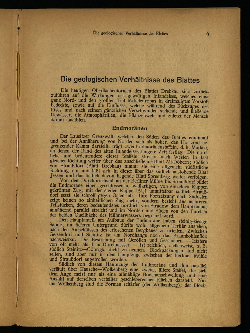 Der Lausitzer Grenzwall, welcher den Süden des Blattes einnimmt "und bei der Annäherung von Norden sich als hoher, den Horizont begrenzender Kamm darstellt, trägt zwei Endmoränenstaffeln, d. h. Marken, an denen der Rand des alten Inlandeises längere Zeit festlag. Die nördliche und bedeutendere dieser Staffeln streicht nach Westen in fast gleicher Richtung weiter über das anschließende Blatt Alt-Döbern; südlich von Straußdorf(Blatt Drebkau) nimmt sie eine allgemein südöstliche Richtung ein und läßt sich in dieser über das südlich anstoßende Blatt Jessen und das östlich davon liegende Blatt Spremberg weiter verfolgen.