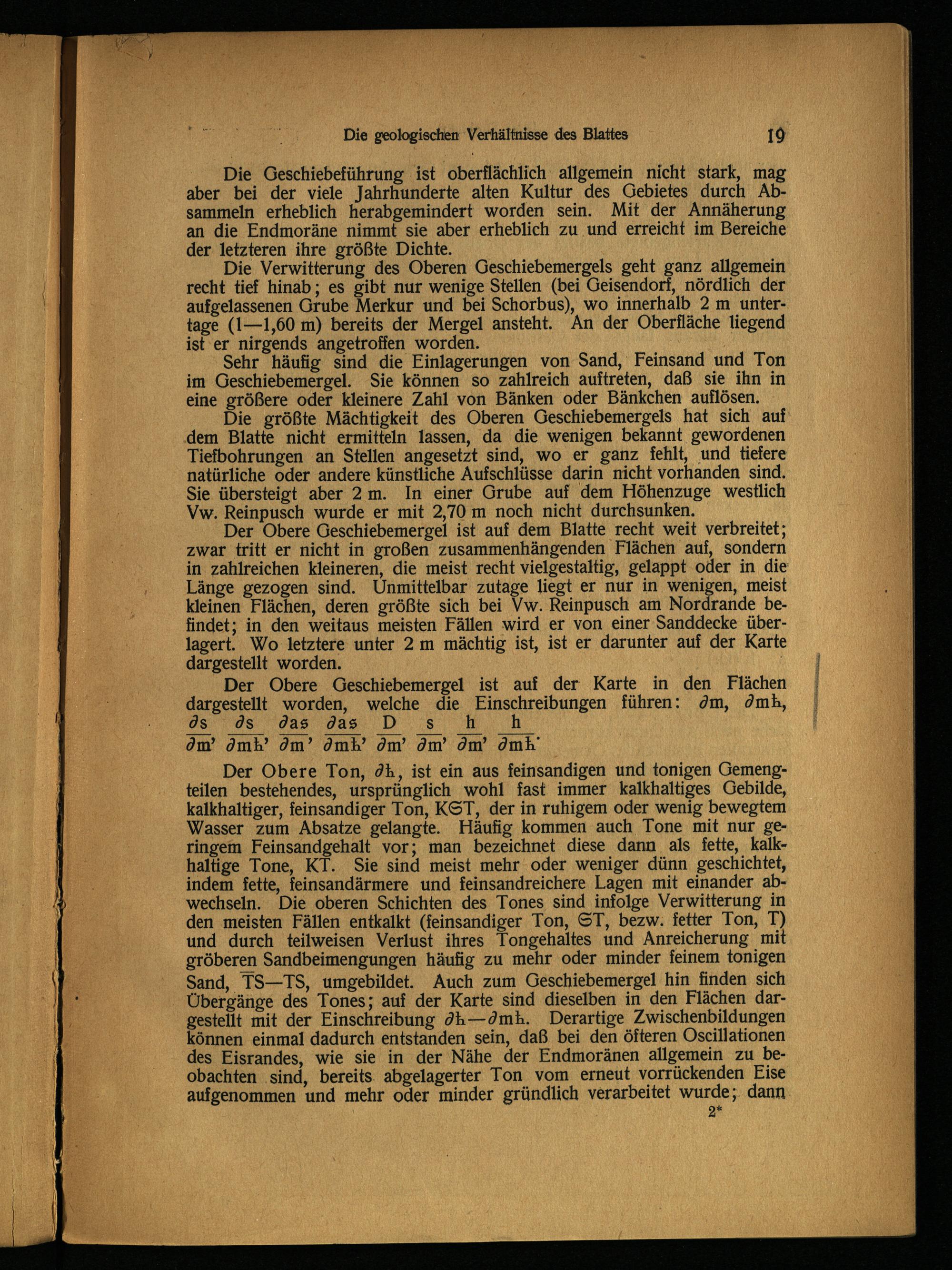 Der Obere Ton, dh, ist ein aus feinsandigen und tonigen Gemengteilen bestehendes, ursprünglich wohl fast immer kalkhaltiges Gebilde, kalkhaltiger, feinsandiger Ton, KST, der in ruhigem oder wenig bewegtem Wasser zum Absatze gelangte. Häufig kommen auch Tone mit nur geringem Feinsandgehalt vor; man bezeichnet diese dann als fette, kalkhaltige Tone, KT. Sie sind meist mehr oder weniger dünn geschichtet, indem fette, feinsandärmere und feinsandreichere Lagen mit einander abwechseln. Die oberen Schichten des Tones sind infolge Verwitterung in den meisten Fällen entkalkt(feinsandiger Ton, ST, bezw. fetter Ton, T) und durch teilweisen Verlust ihres Tongehaltes und Anreicherung mit gröberen Sandbeimengungen häufig zu mehr oder minder feinem tonigen Sand, TS—TS, umgebildet. Auch zum Geschiebemergel hin finden sich Übergänge des Tones; auf der Karte sind dieselben in den Flächen dargestellt mit der Einschreibung dh—dmh. Derartige Zwischenbildungen können einmal dadurch entstanden sein, daß bei den öfteren Oscillationen des Eisrandes, wie sie in der Nähe der Endmoränen allgemein zu beobachten ‚sind, bereits. abgelagerter Ton vom erneut vorrückenden Eise