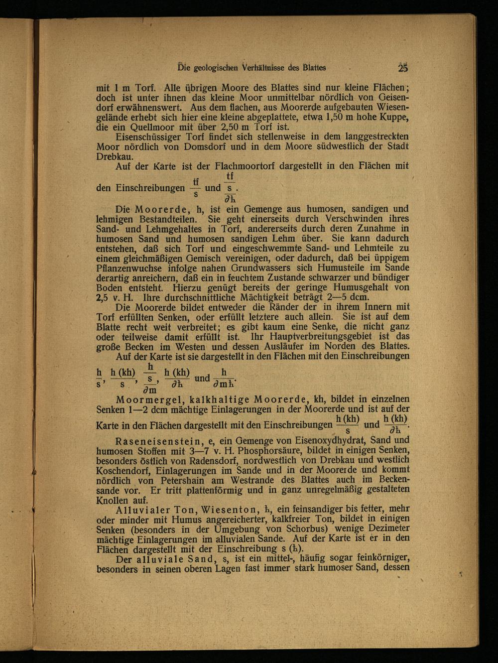 Die Moorerde, h, ist ein Gemenge aus humosen, sandigen und lehmigen Bestandteilen. Sie geht einerseits durch Verschwinden ihres Sand- und Lehmgehaltes in Torf, andererseits durch deren Zunahme in humosen Sand und humosen sandigen Lehm über. Sie kann dadurch entstehen, daß sich. Torf und eingeschwemmte Sand- und Lehmteile zu einem gleichmäßigen Gemisch vereinigen, oder dadurch, daß bei üppigem Pflanzenwuchse infolge nahen Grundwassers sich Humusteile im Sande derartig anreichern, daß ein in feuchtem Zustande schwarzer und bündiger Boden entsteht. Hierzu genügt bereits der geringe Humusgehalt von 2,5 v. H. Ihre durchschnittliche Mächtigkeit beträgt 2—5 dem.