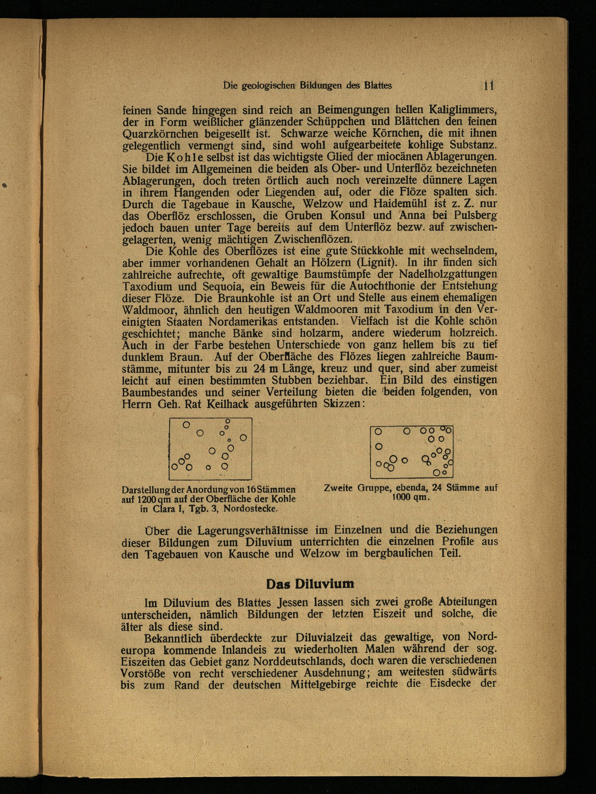 Die Kohle des Oberflözes ist eine‘ gute Stückkohle mit wechselndem, aber immer vorhandenen Gehalt an Hölzern(Lignit). In ihr finden sich zahlreiche aufrechte, oft gewaltige Baumstümpfe der Nadelholzgattungen Taxodium und Sequoia, ein Beweis für die Autochthonie der Entstehung dieser Flöze. Die Braunkohle ist an Ort und Stelle aus einem ehemaligen Waldmoor, ähnlich den heutigen Waldmooren mit Faxodium in den Vereinigten Staaten Nordamerikas entstanden. Vielfach ist die Kohle schön geschichtet; manche Bänke sind holzarm, andere wiederum holzreich. Auch in der Farbe bestehen Unterschiede von ganz hellem bis zu tief dunklem Braun. Auf der Oberfläche des Flözes liegen zahlreiche Baumstämme, mitunter bis zu 24 m Länge, kreuz und quer, sind aber zumeist leicht auf einen bestimmten Stubben beziehbar. Ein Bild des einstigen Baumbestandes und seiner Verteilung bieten die'beiden folgenden, von Herrn Geh. Rat Keilhack ausgeführten Skizzen:;