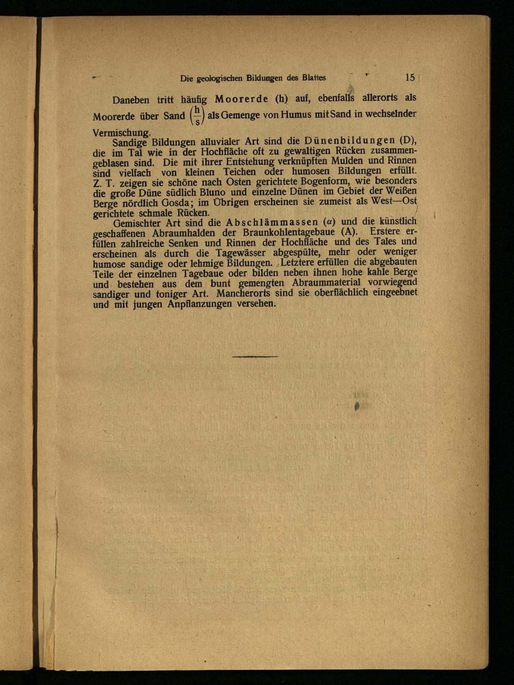 Gemischter Art sind die Abschlämmassen(c«) und die künstlich geschaffenen Abraumhalden der Braunkohlentagebaue(A). Erstere erfüllen zahlreiche Senken und Rinnen der Hochfläche und des Tales und erscheinen als durch die Tagewässer abgespülte, mehr oder weniger humose sandige oder lehmige Bildungen. ‚Letztere erfüllen die abgebauten Teile der einzelnen Tagebaue oder bilden neben ihnen hohe kahle Berge und bestehen aus dem bunt gemengten Abraummaterial vorwiegend sandiger und toniger Art. Mancherorts sind sie oberflächlich eingeebnet und mit jungen Anpflanzungen versehen.