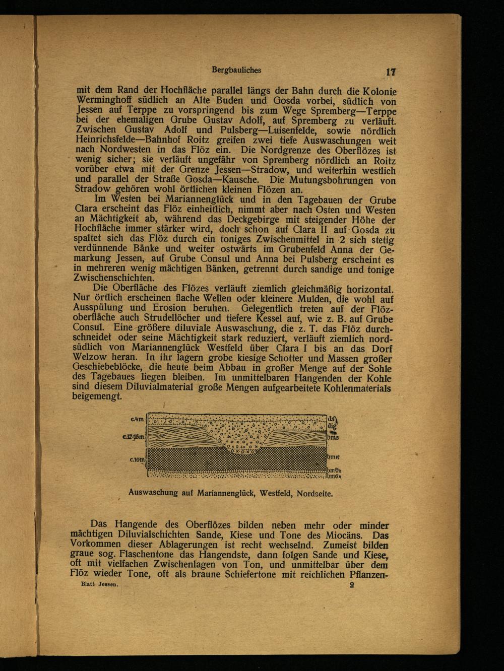 mit dem Rand der Hochfläche parallel längs der Bahn durch die Kolonie Werminghoff südlich an Alte Buden und Gosda vorbei, südlich von Jessen auf Terppe zu vorspringend bis zum Wege Spremberg—Terppe bei der ehemaligen Grube Gustav Adolf, auf Spremberg zu verläuft. Zwischen Gustav Adolf und Pulsberg—Luisenfelde, sowie nördlich Heinrichsfelde—Bahnhof Roitz greifen zwei tiefe Auswaschungen weit nach Nordwesten in das Flöz ein. Die Nordgrenze des Oberflözes ist