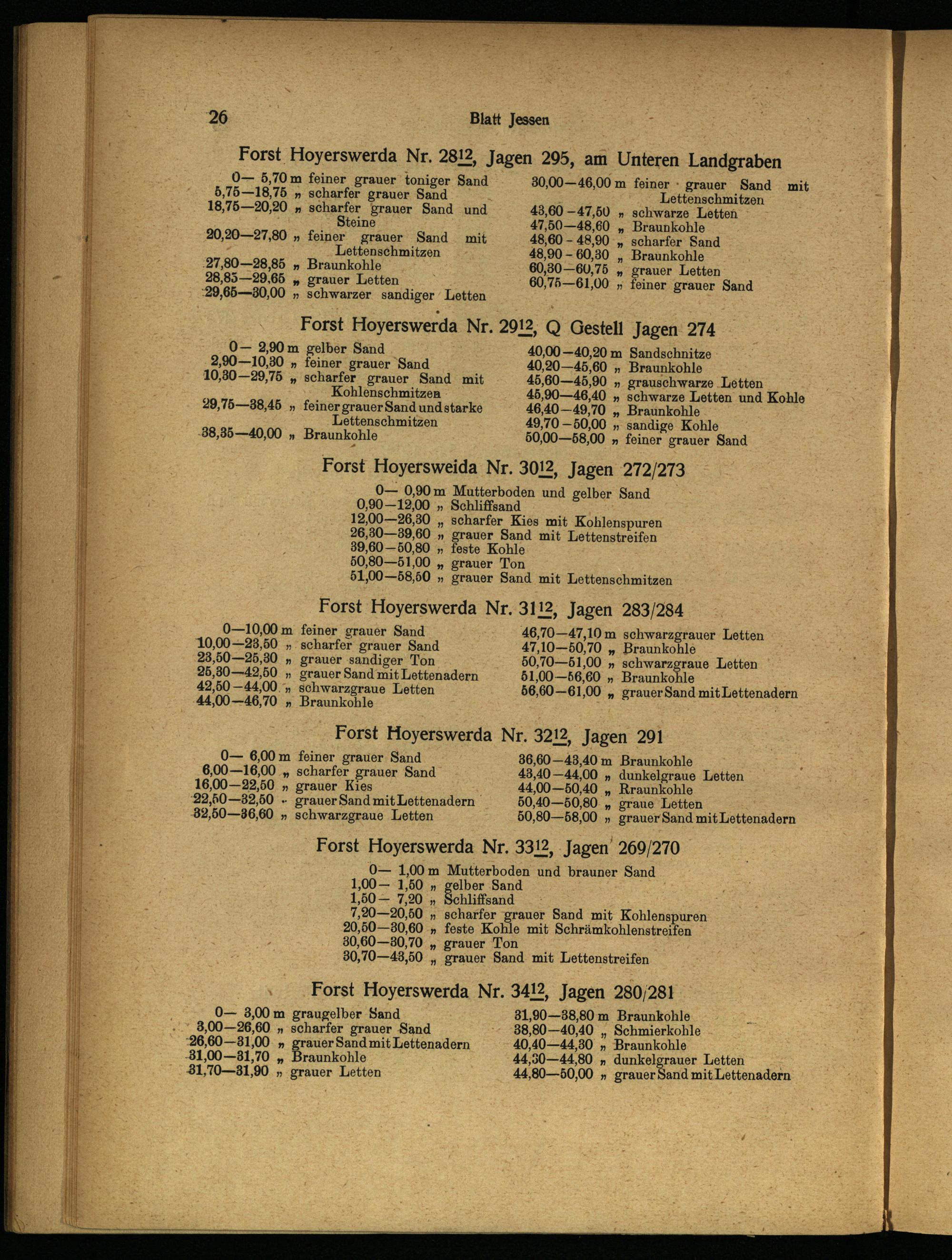 0—10,00 m feiner grauer Sand 46,70—47,10 m schwarzgrauer Letten 10,00—23,50„scharfer grauer Sand 47,10—50,70„ Braunkohle 4 23,50—25,30„ grauer sandiger Ton. 50,70—51,00„ schwarzgraue Letten‘ 25,30—42,50„ grauer Sand mit Lettenadern 51,00—56,60„ Braunkohle 42,50— 44,00.“ schwarzgraue Letten 56,60—61,00„ grauer Sand mit Lettenadern 44,00—46,70„ Braunkohle;