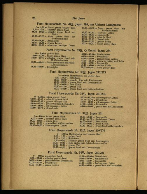 0— 38,00 m graugelber Sand 31,90—838,80 m Braunkohle .'.” 3,00—26,60„ scharfer grauer Sand‘- 88,80—40,40„ Schmierkohle. 26,60—381,00.„ grauer Sand mit Lettenadern 40,40—44,30„ Braunkohle -81,00—31,70„ Braunkohle 44,530—44,80„ dunkelgrauer Letten SE 381,70—31,90„ grauer Letten 44,80—50,00„ grauer Sand mit. Lettenadern