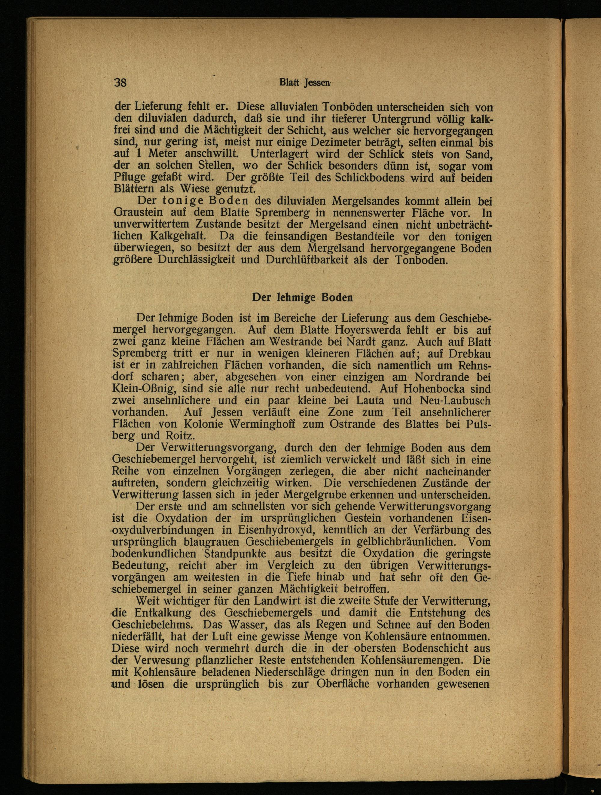 Der lehmige Boden ist im Bereiche der Lieferung aus dem Geschiebemergel hervorgegangen. Auf dem Blatte Hoyerswerda fehlt er bis auf zwei ganz kleine Flächen am Westrande bei Nardt ganz. Auch auf Blatt Spremberg tritt er nur in wenigen kleineren Flächen auf; auf Drebkau ist er in zahlreichen Flächen vorhanden, die sich namentlich um Rehnsdorf scharen; aber, abgesehen von einer einzigen am Nordrande bei Klein-Oßnig, sind sie alle nur recht unbedeutend. Auf Hohenbocka sind zwei ansehnlichere und ein paar kleine. bei Lauta und Neu-Laubusch vorhanden. Auf Jessen verläuft eine Zone zum Teil ansehnlicherer Flächen von Kolonie Werminghoff zum Ostrande des Blattes bei Pulsberg und Roitz.