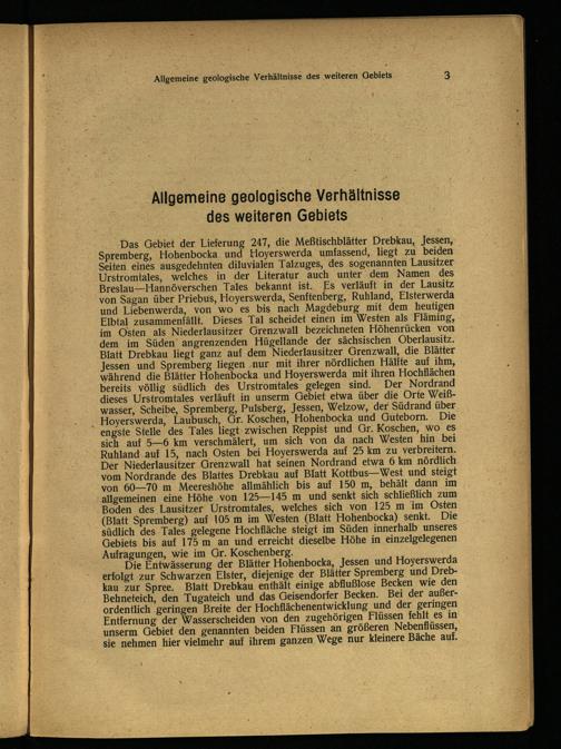 Das Gebiet der Lieferung 247, die Meßtischblätter Drebkau , Jessen, Spremberg , Hohenbocka . und Hoyerswerda. umfassend, liegt zu beiden Seiten. eines ausgedehnten diluvialen Talzuges, des sogenannten Lausitzer Urstromtales , welches in der Literatur auch unter dem Namen. des Breslau —Hannöverschen Tales bekannt. ist. Es verläuft in der Lausitz von Sagan über Priebus, Hoyerswerda , Senftenberg , Ruhland, . Elsterwerda und Liebenwerda, von wo es bis nach Magdeburg mit dem heutigen Elbtal zusammenfällt. Dieses Tal scheidet einen im Westen als Fläming, im Osten als Niederlausitzer Grenzwall bezeichneten Höhenrücken von dem im Süden” angrenzenden Hügellande der sächsischen Oberlausitz . Blatt Drebkau liegt ganz auf dem Niederlausitzer Grenzwall, die Blätter Jessen. und Spremberg liegen ‚nur mit ihrer nördlichen Hälite auf ihm; während die Blätter Hohenbocka . und Hoyerswerda mit ihren Hochflächen bereits völlig südlich des Urstromtales gelegen sind. Der Nordrand dieses Urstromtales verläuft in unserm Gebiet etwa über die Orte Weiß wasser , Scheibe, Spremberg , Pulsberg, Jessen, Welzow , der Südrand über Hoyerswerda , Laubusch , Gr. Koschen, Hohenbocka und Guteborn. Die engste Stelle des Tales liegt zwischen Reppist und Gr. Koschen, wo es sich auf 5—6 km verschmälert, um sich von da nach Westen hin bei Ruhland - auf 15, nach Osten bei Hoyerswerda auf 25 km zu verbreitern. Der Niederlausitzer Grenzwall hat seinen Nordrand etwa 6 km nördlich vom Nordrande des Blattes Drebkau auf Blatt Kottbus— West und steigt von 60—70 m Meereshöhe allmählich bis auf 150 m, behält dann im allgemeinen eine Höhe von 125—145 m und senkt sich schließlich zum Boden des Lausitzer Urstromtales , welches sich von 125 m im Osten (Blatt Spremberg ) auf 105 m im Westen(Blatt Hohenbocka) senkt. Die südlich des Tales gelegene Hochfläche steigt im Süden innerhalb unseres Gebiets bis auf 175 m an und erreicht dieselbe Höhe in einzelgelegenen Aufragungen, wie im Gr. Koschenberg.;