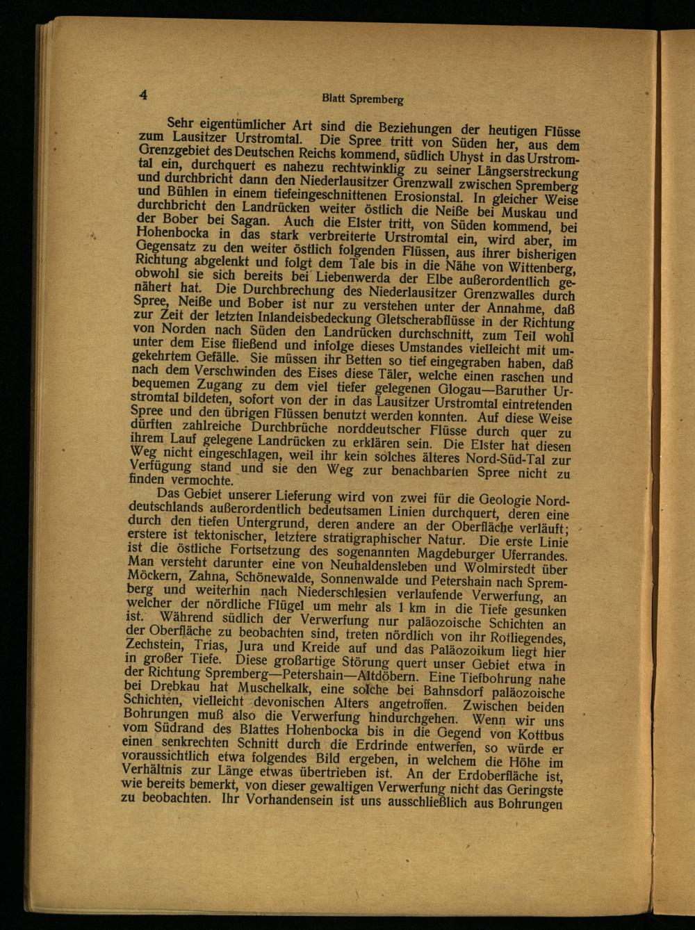 Sehr eigentümlicher Art sind die Beziehungen der heutigen Flüsse zum Lausitzer Urstromtal . Die Spree. tritt von Süden her, aus dem Grenzgebiet des Deutschen Reichs kommend, südlich Uhyst in das Urstromtal ein, durchquert es nahezu rechtwinklig zu seiner Längserstreckung und durchbricht dann den Niederlausitzer Grenzwall zwischen Spremberg und Bühlen in einem tiefeingeschnittenen Erosionstal. In gleicher Weise durchbricht den Landrücken weiter östlich die Neiße bei Muskau und der Bober bei Sagan. Auch die Elster tritt, von Süden kommend, bei Hohenbocka in das stark verbreiterte Urstromtal ein, wird aber, im Gegensatz zu den weiter östlich folgenden Flüssen, aus ihrer bisherigen Richtung abgelenkt und folgt dem Tale bis in die Nähe von Wittenberg , obwohl sie sich bereits bei Liebenwerda der Elbe außerordentlich genähert hat. Die Durchbrechung des Niederlausitzer Grenzwalles durch Spree, Neiße und Bober ist nur zu verstehen unter der Annahme, daß zur Zeit der letzten Inlandeisbedeckung Gletscherabflüsse in der Richtung von Norden nach Süden den Landrücken durchschnitt, zum Teil wohl unter dem Eise fließend und infolge dieses Umstandes vielleicht mit umgekehrtem Gefälle. Sie müssen ihr Betten so tief eingegraben haben, daß nach dem Verschwinden des Fises diese Täler, welche einen raschen und bequemen Zugang zu dem viel tiefer gelegenen Glogau—Baruther Urstromtal bildeten, sofort von der in das Lausitzer Urstromtal eintretenden Spree und den übrigen Flüssen benutzt werden konnten. Auf diese Weise dürften zahlreiche Durchbrüche norddeutscher Flüsse durch quer zu ihrem Lauf gelegene Landrücken zu erklären sein. Die Elster hat diesen Weg nicht eingeschlagen, weil ihr kein solches älteres Nord-Süd-Tal zur Verfügung stand und sie den Weg zur benachbarien Spree nicht zu finden vermochte.: