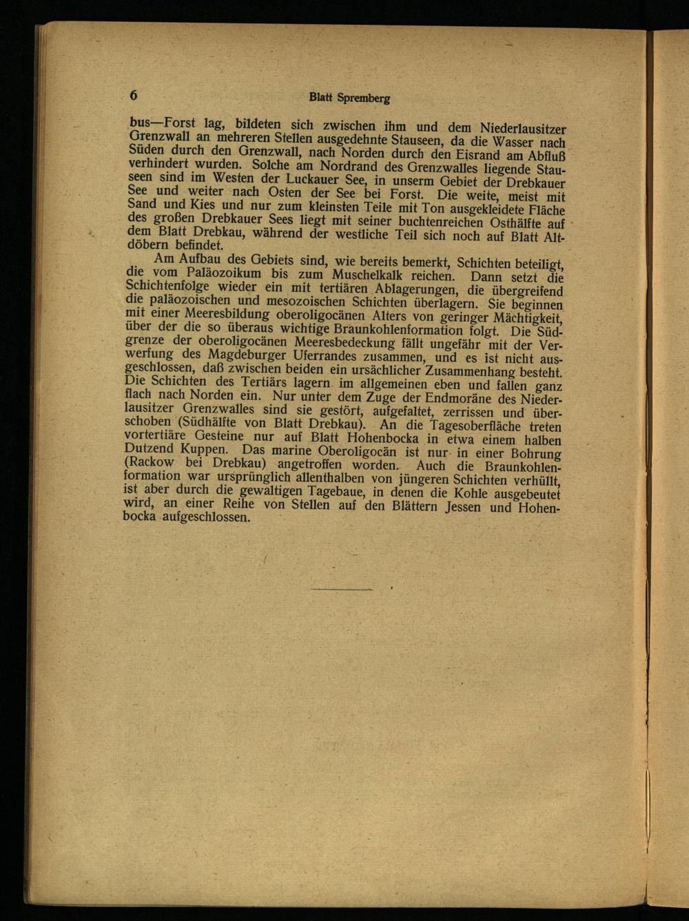 Am Aufbau des Gebiets sind, wie bereits bemerkt, Schichten beteiligt, die vom Paläozoikum bis zum Muschelkalk reichen. Dann setzt. die Schichtenfolge wieder ein mit tertiären ‚Ablagerungen, die übergreifend die paläozoischen und mesozoischen Schichten überlagern.. Sie beginnen mit einer Meeresbildung oberoligocänen Alters von geringer Mächtigkeit, über der die so überaus wichtige Braunkohlenformation folgt. Die Südgrenze der oberoligocänen Meeresbedeckung fällt ungefähr mit der Verwerflung des Magdeburger Uferrandes zusammen, und es ist nicht ausgeschlossen, daß zwischen beiden ein ursächlicher Zusammenhang besteht. Die Schichten des Tertiärs lagern. im allgemeinen eben und fallen ganz flach nach Norden ein. Nur unter dem Zuge der Endmoräne des Nieder lausitzer Grenzwalles sind sie gestört, aufgefaltet, zerrissen und‘ überschoben(Südhälfte von Blatt Drebkau ). An die Tagesoberfläche treten vortertiäre Gesteine nur auf Blatt Hohenbocka in etwa einem halben Dutzend Kuppen. Das marine Oberoligocän ist nur- in einer Bohrung (Rackow bei Drebkau ) angetroffen worden. Auch die Braunkohlen. formation war ursprünglich allenthalben von jüngeren Schichten verhüllt, ist aber durch die gewaltigen Tagebaue, in denen die Kohle ausgebeutet wird, an einer Reihe von Stellen auf den Blättern Jessen und Hohen bocka aufgeschlossen.