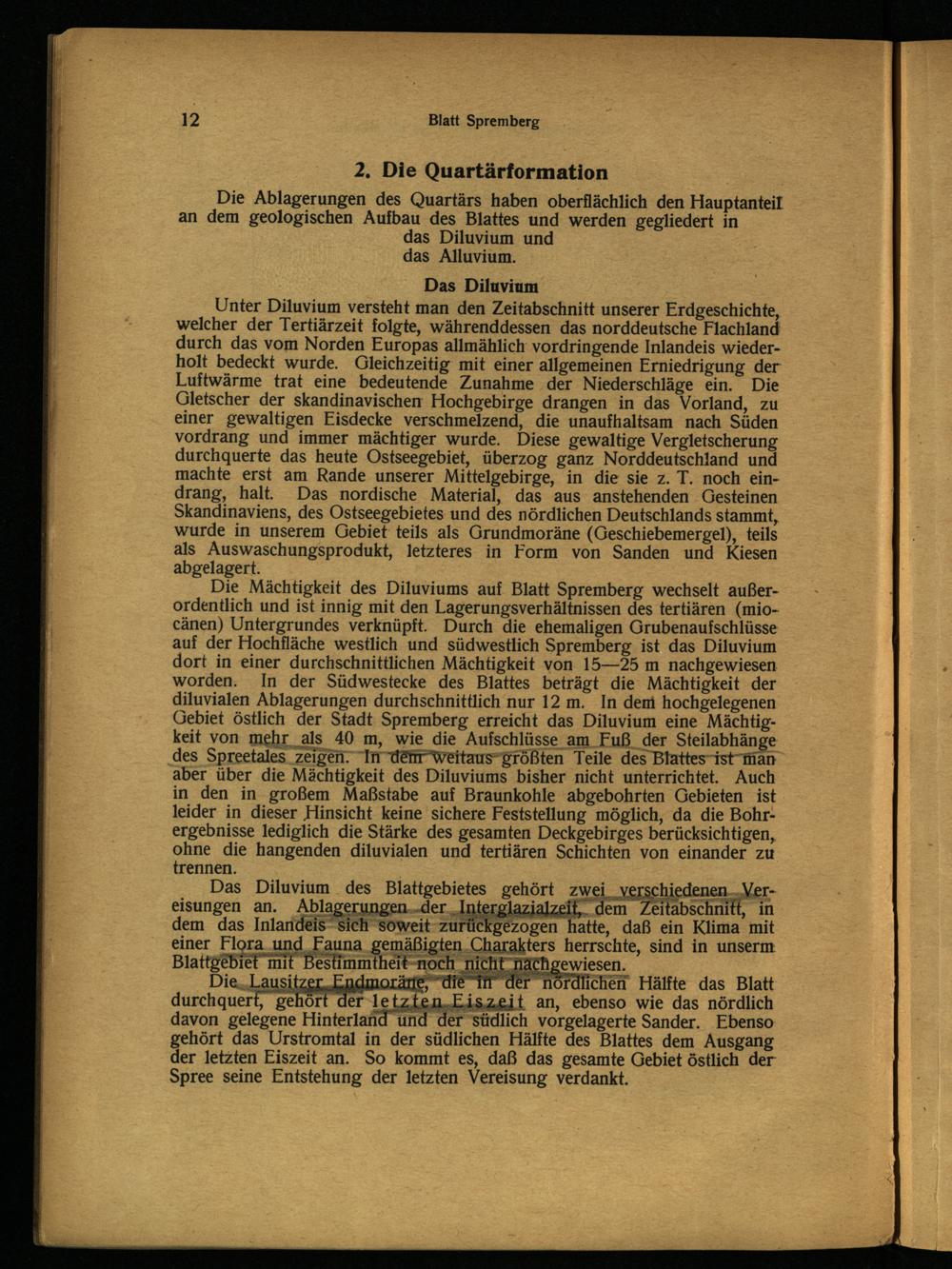 Die Mächtigkeit des Diluviums auf Blatt Spremberg wechselt außerordentlich und ist innig mit den Lagerungsverhältnissen des tertiären(miocänen) Untergrundes verknüpft. Durch die ehemaligen Grubenaufschlüsse auf der Hochfläche westlich und südwestlich Spremberg ist das Diluvium dort in einer durchschnittlichen Mächtigkeit von 15—25 m nachgewiesen worden. In der Südwestecke des Blattes beträgt die Mächtigkeit der diluvialen Ablagerungen durchschnittlich nur 12 m. In dem hochgelegenen Gebiet östlich der Stadt Spremberg erreicht das Diluvium eine Mächtigkeit von mehr als 40 m, wie die Aufschlüsse am Fuß der Steilabhänge des Spreetales_zeigen."In defr Weitaus“Srößten Teile des Blattes-ist man aber über die Mächtigkeit des Diluviums bisher nicht unterrichtet. Auch in den in großem Maßstabe auf Braunkohle abgebohrten Gebieten ist leider in dieser Hinsicht keine sichere Feststellung möglich, da die Bohrergebnisse lediglich die Stärke des gesamten Deckgebirges berücksichtigen, ohne die hangenden diluvialen und tertiären Schichten von einander zıt trennen.