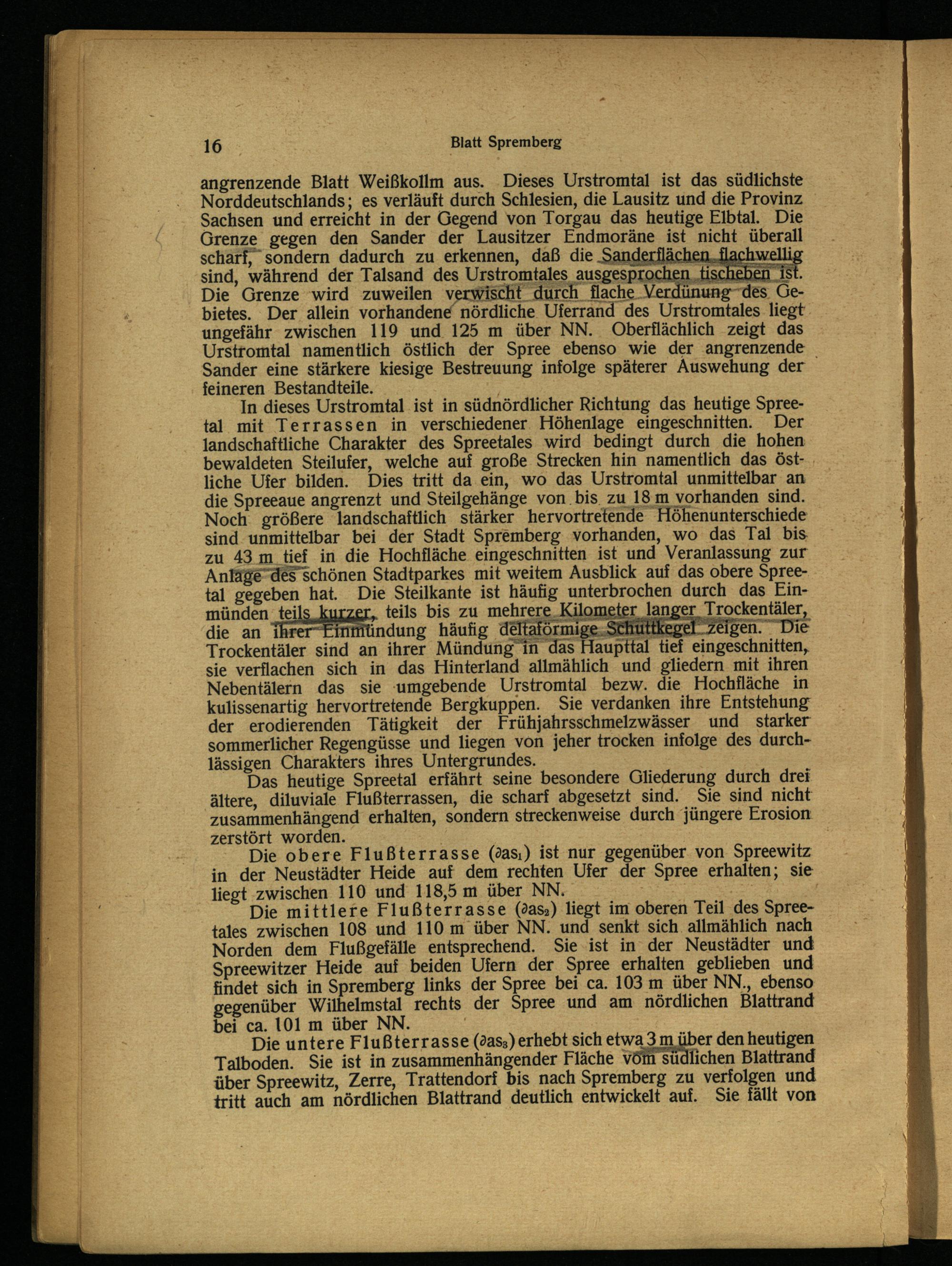 In dieses Urstromtal ist in südnördlicher Richtung das heutige Spreetal mit Terrassen in verschiedener Höhenlage eingeschnitten. Der landschaftliche Charakter des Spreetales wird bedingt durch die hohen bewaldeten Steilufer, welche auf große Strecken hin namentlich das östliche Ufer bilden. Dies tritt da ein, wo das Urstromtal unmittelbar an die Spreeaue angrenzt und Steilgehänge von bis zu 18 m vorhanden sind. Noch größere landschaftlich stärker hervortretende Höhenunterschiede sind unmittelbar bei der Stadt Spremberg vorhanden, wo das Tal bis zu 43 m tief in die Hochfläche eingeschnitten ist und Veranlassung zur Anlage des schönen Stadtparkes mit weitem Ausblick auf das obere Spree tal gegeben hat. Die Steilkante ist häufig unterbrochen durch das Einmünden teils kurzer, teils bis zu mehrere Kilometer langer Trockentäler, die an ihrer Einmündung häufig deltaförmige Schuttkegel zeigen. Die Trockentäler sind an ihrer Mündung in das Haupttal tief eingeschnitten, sie verflachen sich in das Hinterland allmählich und gliedern mit ihren Nebentälern das sie umgebende Urstromtal bezw. die Hochfläche in kulissenartig hervortretende Bergkuppen. Sie verdanken ihre Entstehung der erodierenden Tätigkeit der Frühjahrsschmelzwässer und starker sommerlicher Regengüsse und liegen von jeher trocken infolge des durchlässigen Charakters ihres Untergrundes.