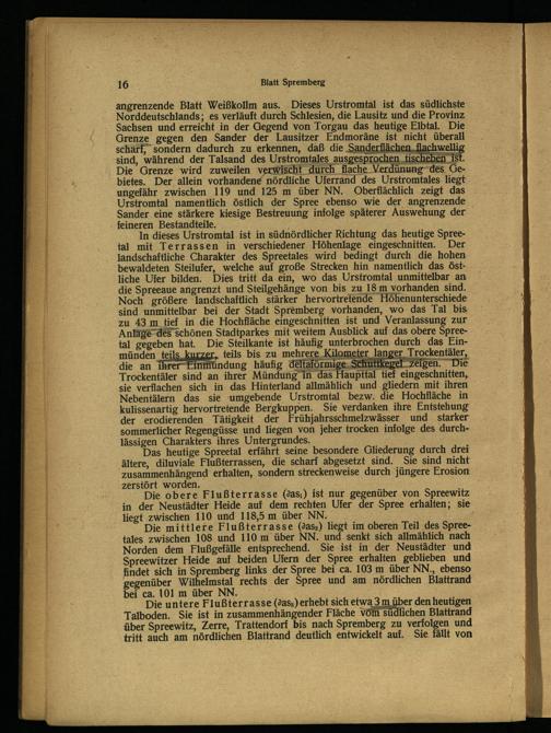 angrenzende Blatt Weißkollm aus. Dieses Urstromtal ist das südlichste Norddeutschlands; es verläuft durch Schlesien , die Lausitz und die Provinz Sachsen und erreicht in der Gegend von Torgau das heutige Elbtal. Die Grenze gegen den Sander der Lausitzer Endmoräne ist nicht überall scharf, sondern dadurch zu erkennen, daß die Sanderflächen flachwellig sind, während der Talsand des Urstromtales ausgesprochen tischeben ist. Die Grenze wird zuweilen verwischt durch flache Verdünung des Gebietes. Der allein vorhandene nördliche Uferrand des Urstromtales liegt ungefähr zwischen 119 und 125 m über NN. Oberflächlich zeigt das Urstromtal namentlich östlich der Spree ebenso wie der angrenzende Sander eine stärkere kiesige Bestreuung infolge späterer Auswehung der feineren Bestandteile.