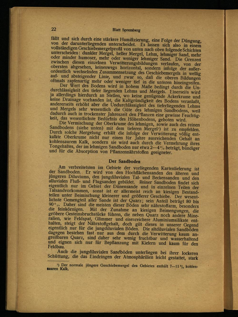 Der Wert des Bodens wird in hohem Maße bedingt durch die Undurchlässigkeit des tiefer liegenden Lehms und Mergels. Einerseits wird ja allerdings hierdurch an Stellen, wo- keine genügende Ackerkrume und keine Drainage vorhanden ist, die Kaltgründigkeit des Bodens veranlaßt, andererseits erhöht aber die Undurchlässigkeit des tieferliegenden Lehms und Mergels sehr wesentlich die Güte des lehmigen Sandbodens, weil dadurch auch in trockenster Jahreszeit den Pflanzen eine gewisse Feuchtigkeit, das wesentlichste Bedürfnis des Höhenbodens, geboten wird.